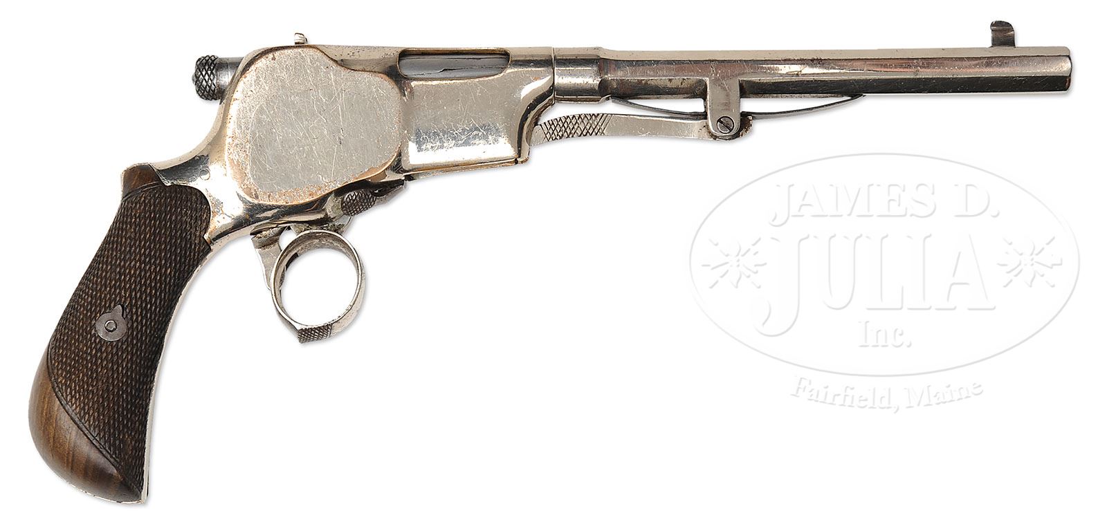 RARE PASSLER & SEIDL REPEATING PISTOL. SN NSN. Cal. 7.5mm. Extremely rare Passler & Seidl with 5.5″ bbl fixed front and rear sight. The top of the frame is marked “PATENT./ SEIDL.WIEN./ U. BUDWEIS.” Behind the rear sight is the marking “18 12./5. 87” reflecting 12 May 1887 patent date. There are no serial numbers or proofs on the gun. The entire repeater is nickel plated including the brass frame. Function is similar to the Schulof pistols. Feeding is from a stripper clip inserted at the bottom of the frame with a long spring-loaded arm serving to ensure positive feeding. There is no apparent safety. Grips are finely checkered panels secured with a single transverse screw. PROVENANCE: Dr. Geoffrey Sturgess Collection, “Vom Ursprung der Selbstladepistole” pp. 86, 87. CONDITION: Approximately 95-97% nickel with minor nicks and toning. The word “Passler” has been removed from the top of the frame, between the words “PATENT.” and “SEIDL WIEN.” The site of this removal remains as exposed brass. Orig grips with minor handling marks and negligible losses, in keeping with the overall condition of the pistol. Bright bore with strong rifling and minimal erosion. Perfect mechanics. An extremely rare repeater that reflects an undocumented rift between Passler and Seidl in the altered frame inscription. 4-53297 LMA99 (10,000-20,000)