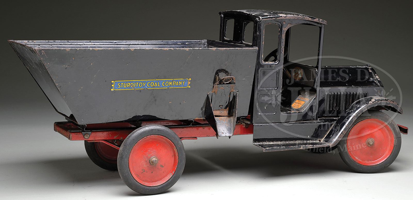 STURDITOY COAL TRUCK WITH SIDE CHUTE. A relatively obscure Sturditoy vehicle, the coal bed is shaped to funnel its load through the right front corner of the bed. There is a small exterior chute with a flap to release the coal and into the waiting coal bin. Oftentimes the truck would pull alongside the house, and of course it would make perfect sense to unload through the side versus backing up into the street and unloading through the rear. At some point in time, there was a small tin removable chute that would have attached to the fixed chute that would allow the coal to travel a distance over the sidewalk directly into the coal bin in the basement. As is typical, it features tin disc wheels with black rubber tires, and this particular toy has a decal on the dashboard with simulated gauges and a slightly earlier Sturditoy decal on the floorboard, which reads “Made by Pressed Metal Co., Pawtucket, RI.” SIZE: 24″ l. CONDITION: Overall good to very good. Some paint chipping to cab roof, front fenders, and most noticeable at bottom of funnel on bed of vehicle. 1-13083 (1,500-2,500) Auction: Advertising, Toy & Doll - June 2013 Please Note: All prices include the hammer price plus the buyer’s premium, which is paid by the buyer as part of the purchase price. The prices noted here after the auction are considered unofficial and do not become official until after the 46th day. |