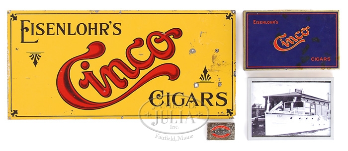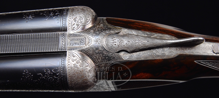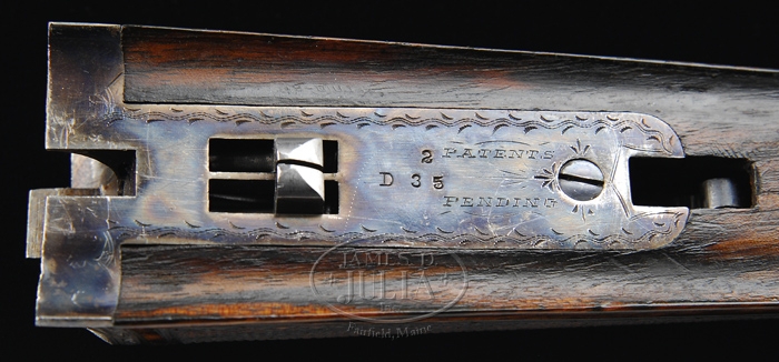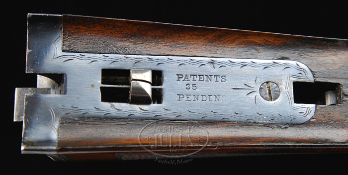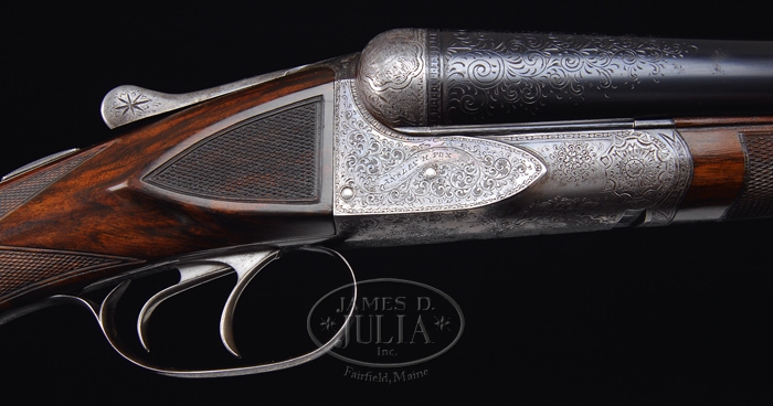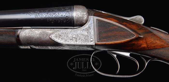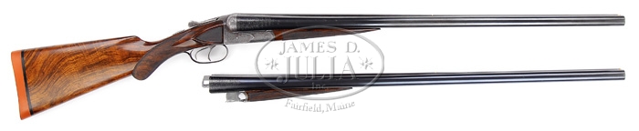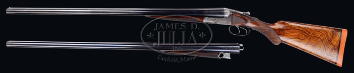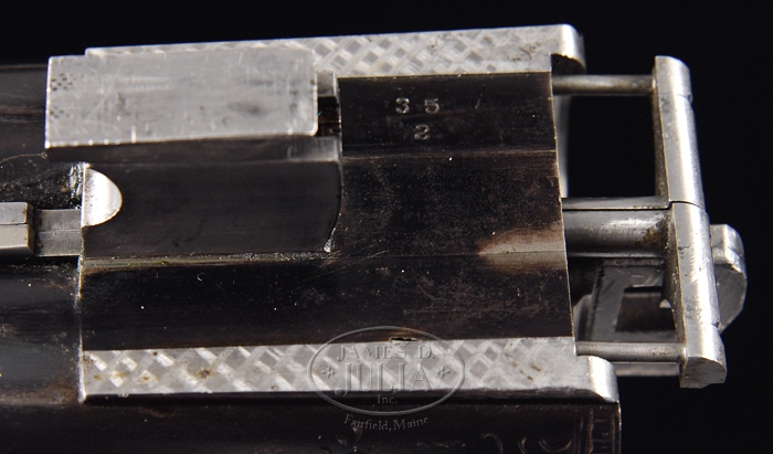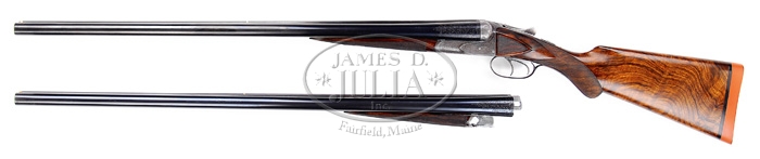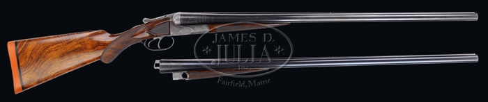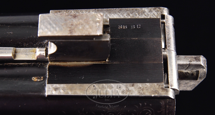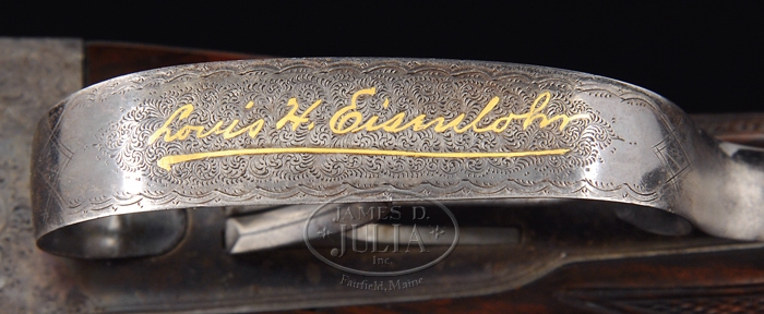 *EXTRAORDINARILY RARE FOX GRADE CSE DOUBLE BARREL SHOTGUN 2-BARREL SET. SN 35. Cal. 12 ga. This storied shotgun was built in 1905 for Fox Company Director, Louis H. Eisenlohr. Mr. Eisenlohr, in addition to being one of the directors of the Fox Shotgun Company, was a entrepreneur of some note, owning a cigar company with his brothers in Philadelphia. This spectacular shotgun has two sets of bbls, one 28”(#1) choked FULL/FULL and No. 2 is 30” (#2) choked FULL/FULL. Both sets of bbls have tapered concave matted ribs with dbl ivory beads, crossbolt rib extensions & ejectors. The 28” bbls have the std company roll mark of “KRUPP FLUID STEEL MADE BY” on right side and “A.H. FOX GUN CO. PHILA. PA” on left side. The 30” bbls are engraved “KRUPP FLUID STEEL MADE TO ORDER” on right side and “BY A.H. FOX GUN CO. PHILA. PA. U.S.A.” on left side. Bbl flats of #1 bbls are simply marked “35 BC” and inside of ejectors are marked “35”. Bbl flats of #2 bbls are marked “D 35 / 2” and inside of ejectors are stamped “35 /2”. Inside forend irons are marked identically to their respective bbls with #1 forearm being roll marked and #2 forearm engraved. Both are marked “PATENTS / PENDING”. The edges of bbl flats are nicely scraped for oil retention. Water table has lightly stamped “1905” Patent date and “OTHER PATENTS PENDING”. The serial number and “CS” are also stamped on water table with the “C” being very deeply stamped. Patent date stampings, being so light, were probably stamped after the frame was case hardened. Receiver & appended metal are very beautifully & unusually engraved in extremely fine foliate & floral arabesque patterns with tiny game scenes of a quail on left fence and a woodcock on right fence with maker’s name in a ribbon on each side. Forward relieved areas of sides of frame have a flower blossom surrounded by arabesque patterns and the ends of hinge pin have geometric patterns. Bottom of receiver has a large vignette of two bird dogs in a very detailed scene with partial punch dot background. Trigger bow is engraved in extraordinarily fine foliate arabesque patterns and inlaid in script flat gold “Louis H. Eisenlohr” with a tapered gold line underneath. Trigger guard has serial number engraved and there is a line just above trigger guard screw. Engraving extends about 2-3/4” over chambers on 28” bbls and about 2-1/2” on 30” bbls. Mounted with extremely beautiful, very highly figured, streaky French or circassian walnut with fine, full coverage checkered splinter forearms with the one for bbl #1 having a wide band at back edge and a wide band around latch. The latch & all forend iron have a fine high polish blue. Bbl #2 forearm has full coverage with only narrow bands of uncheckered wood. The latch & all forend iron on this forearm are case colored. Buttstock has checkered raised side panels with a long rnd knob Prince of Wales grip and is 14” over a solid red pad. This shotgun is extensively covered in A.H. Fox. . The Finest Gun in the World, McIntosh, in full color on pp. 20, 75, 308 & 317, along with a lengthy written discussion wherein Mr. McIntosh states that this shotgun is undoubtedly authentic and a higher than “C” grade. The “CS”, as stamped on water table, he speculates may stand for “C Special” or “Custom Special”. He also states that this is the earliest gun of which he is aware that has ejectors. He says that the engraving is of a quality consistent with the later, higher grade guns including the very rare “F” grades. This shotgun was also extensively covered in a 10-page article in The Double Gun Journal, Vol. 12, Issue 1, Spring 2001 by David J. Noreen titled “Number 35”. There are numerous full color photographs by William Headrick. Mr. Noreen discusses the history of the Fox Company and goes into great detail in discussing this shotgun and names it the second finest Fox that he has ever seen with the “finest workmanship I’ve seen on an Ansley H. Fox gun”. He says that he finds it “much more attractive than the later Gough raised gold specials” and that it is very similar to C. William Hayward’s “E” grade Philadelphia Arms Company gun, shown in The Double Gun Journal, Vol. 2, Issue 1. Accompanied by three pieces of Eisenlohr Cigar Company memorabilia and a photograph. 1) Metal sign, 19-1/2” x 9-1/4”, with yellow background and red & black lettering advertising “CINCO” cigars. 2) Tin cigar box, 8-1/8” x 5” x 1-1/8” with blue, red & gold paint with same advertisement. 3) Metal penny matchbox cover with “OTTO EISENLOHR BROS. INC.” for the Henrietta brand; both sides are open for access to striker. 4) Small framed photograph of a very early motor yacht named “ELF” at anchorage with ice on rigging. This was Louis Eisenlohr’s private yacht. It was apparently loaned to or commandeered by the U.S. Government and became the U.S.S. Elf 1917-1919. BBLS #1: Bore diameter: left – .721, right – .721. Bore restrictions: left – .032, right – .032. Wall thickness: left – .042, right – .043. Weight: 7 lbs. 7.04 oz. BBLS #2: Bore diameter: left – .728, right – .728. Bore restrictions: left – .036, right – .036. Wall thickness: left – .039, right – .037. Weight: 7 lbs. 12.16 oz. .Drop at heel: 2-3/8”, drop at comb: 1-1/2”. CONDITION: Extremely fine. No. 1 bbls retain about 98% of a fine rust blue finish that may be an extremely fine professional restoration with some thinning & dulling about mid-point just forward of forearm with some very fine pitting on bbl extension and left ejector with some very fine scratches on left side. No. 2 bbls retain about same amount of blue that appears to be original, also thinned over forearm area. Both sets of bbls have brilliant shiny bores. Receiver retains 30-40% orig case colors, moderately faded, stronger in sheltered areas with balance turned silver. Trigger guard retains about 60% thin o