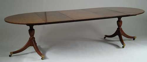GEORGE III MAHOGANY TWO PEDESTAL DINING TABLE. Last quarter of the 18th Century. Table consists of two 24” D-shaped ends supported by an urn pedestal with three outstretching legs ending in brass cup caster feet. Three leaves (22-1/2”; 18-1/2” and 18-1/2”). Two supporting long cleats stabilize underneath which are removable. PROVENANCE: Woolworth Collection, Monmouth, Maine (F. W. Woolworth Dept. Store family) SIZE: 28” h x 50” w x 107-1/2” l (open). CONDITION: Generally very good. 9-99203 (5,000-10,000)