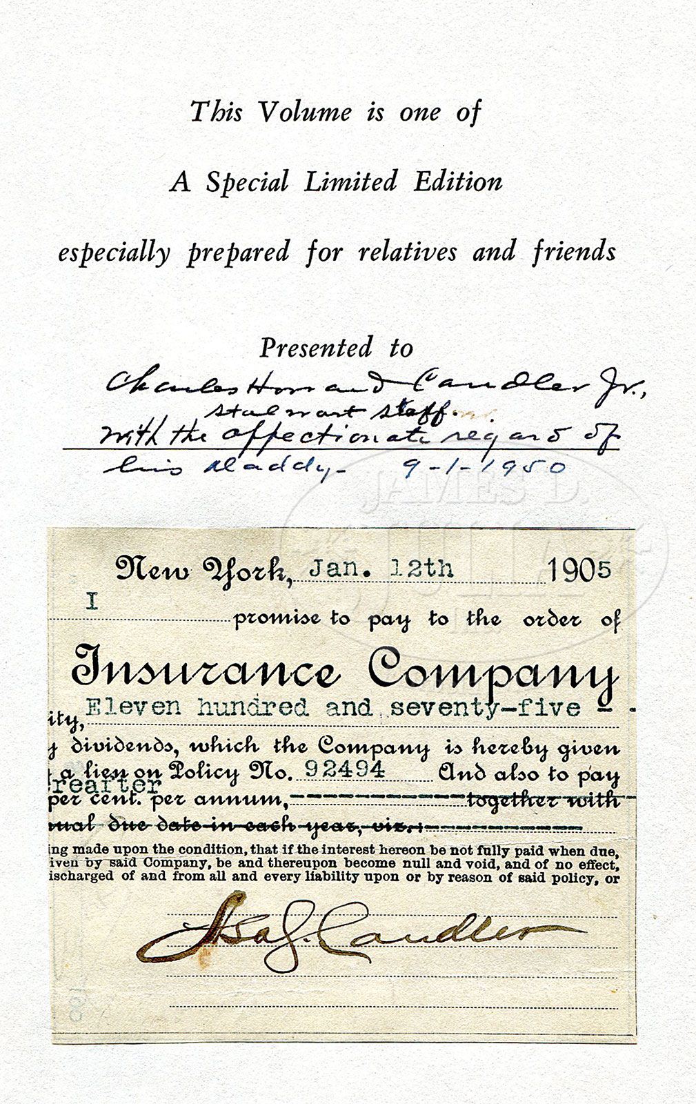 ONLY EXTANT 1888 ASA G. CANDLER & CO. ALBUMEN PHOTOGRAPH & ASA GRIGGS CANDLER FAMILY BOOK BEARING CANDLER SIGNATURES. In 1910 Coca-Cola Co. founder Asa Griggs Candler ordered all original corporate documents destroyed and burned. Mark Pendergrast stated this in his book For God, Country and Coca-Cola. Also according to Coca-Cola historian Pendergrast, in 1914, original Coca-Cola Co. shareholder Margaret Dozier threatened legal action over an alleged forgery of her signature on her share title transfer document for the original 1888 founded company. The authenticity of Dr. John Pemberton’s 1888 title transfer signature was also raised at this time by Dozier. Only one single original photograph of Coca-Cola inventor Dr. Pemberton appearing with Asa Griggs Candler exists today. Mount with upper right hand corner section broken off, with remains of the date “1888” in pencil evident. Lower section of mount has imprinted “Kuhns’ Photo.” and “Atlanta, GA.” Verso of mount has written in 20th century blue ink quill pen “Property of Charles James Come, North Chatham, N.Y.” Handwriting appears to be circa 1920’s-1940’s. Found in Atlanta, Georgia in the late 1990’s, the “1888 Asa G. Candler & Co.” albumen is accompanied by a copy of the Coca-Cola founder’s biography Asa Griggs Candler, written by son Charles Howard Candler (1878-1957), inscribed by the author to his son “Charles Howard Candler, Jr. ” in blue ink; signed “his Daddy – 9 – 1 – 1950.” To Coca-Cola founder Asa G. Candler, Charles Howard Candler was the eldest of three children. The book was published in 1950 by Georgia’s Emory University at Atlanta. This copy was handed down in the Asa Griggs Candler family and bears the signature reference of three generations of Candlers. It includes a tipped-in partial document bearing the actual autograph signature of Asa Griggs Candler (1851-1929), co-founder of Coca-Cola Company in 1888 and later founder in 1892 of The Coca-Cola Company. On page 68 of the privately printed book Asa Griggs Candler is reproduced this exact photograph. Further research has yielded that the photograph reproduced in the book is off a modern mid-20th century Kodak “Velox” black and white silver-bromide copy photo that in turn was taken from the original only extant “1888 Asa G. Candler & Co.” albumen. The consignor worked with reference archivists at the Manuscript, Archives, and Rare Book Library at Emory, further documenting the “1888 Asa G. Candler & Co.” albumen and concluding this final aspect of the research process. Damage and emulsion loss that had occurred to the right hand edge emulsion section of the original “1888 Asa G. Candler & Co.” albumen when the card stock mount and photograph sustained damage and cracks to same during its existence, was detected in the modern mid-20th century Kodak “Velox” copy photographs on file in the Asa Griggs Candler and Candler family papers at Emory as well. This proved that all of the known modern mid-20th century Kodak “Velox” copy photographs were indisputably made from the original “1888 Asa G. Candler & Co.’ albumen. Reference archivists at the Manuscript, Archives, and Rare Book Library at Emory University believe this photograph to be the same one reproduced in Candler’s son’s 1950 historical tome. This most recent discovery by the photograph’s consignor – author and historian Richard Warren Lipack, completed the research on the “1888 Asa G. Candler & Co.” albumen. According to the library, this documentation has been placed in the internal reference files or ‘vertical files’ of the Manuscript, Archives, and Rare Book Library at Emory containing the Asa Griggs Candler / Candler family papers. A complete print-out of this documentation is provided with this lot. Stated by Charles Howard Candler in his book, his father Asa managed to purchase the controlling shares to the original Coca-Cola Co. on April 14, 1888, the very same day it is believed the “1888 Asa G. Candler & Co.” albumen was taken. In the photograph, Dr. John S. Pemberton is seen standing in the doorway beside his name on the window, along with the name of an obscure elixir drink product Pemberton was selling then; called “Lemon Orange E.” This elixir may be suitable for trademark registration and distribution today without a license required from the Atlanta cola company Giant! The image is the only known actual original photograph showing Pemberton, as all others are either taken from news clippings or have been fabricated over the past century from other sources as artist renderings. The “1888 Asa G. Candler & Co.” albumen also represents the only known example of both Pemberton and Candler in the same image extant. The albumen shows the key element of essentially when the interests of Coca-Cola Co. became codified and taken over by Asa G. Candler. The original Candler pharmacy building located at 47 Peachtree St., Atlanta – where the Coca-Cola syrup was first manufactured in bulk, is prominently pictured in the photo. The albumen shows Candler standing just a few feet away in front of the words “Asa G. Candler & Co.” on the main storefront window, with Candler holding a piece of paper in one hand. This paper is likely the actual transfer contract and the infamous Coca-Cola ‘secret recipe.’ The original Coca-Cola “French Wine Coca” drink name is also found on the window next to where Pemberton is seen standing. Significantly, Pemberton, a morphine addict from a Civil War injury, died from cancer in August 1888, approximately four months after this “1888 Asa G. Candler & Co.” photo was taken. This photograph is believed to have been originally the property of Asa G. Candler and once hung framed in one of his Atlanta homes. Candler’s second son, Asa G. Candler, Jr. (1880–1953), was a depressed eccentric alcoholic. By the 1930’s he squandered much of his family inheritance. To suppo