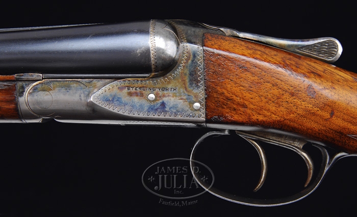 *PHILADELPHIA MADE AH FOX STERLINGWORTH SN 260929. Cal. 20 ga. 26″ bbls choked IMP. CYL/MOD 2-1/2″ chambers with tapered concave matted rib and single sighting bead, double triggers and extractors. Mounted with straight grain American walnut with checkered splintered forend and pistol grip stock, 14-1/4″ over hard rubber buttplate. Bore restrictions: left -.019, right -.010. Wall thickness: left-.029, right -.030. Bore diameter: left -.620, right -.620. Drop at heel: 3-3/8″, drop at comb: 1-3/4″ Weight 5 lbs, 14 oz. CONDITION: Fine. Bbls retain 93-95% original blueing with just a few light rust marks. Receiver has 75-80% strong case coloring with only balance point silvering due to light carry wear. Trigger guard has 90% original blue. Stocks are fine with 90% original varnish showing just normal modest hunting use. Buttplate and pistol grip cap are clean and unchipped. Mechanics are crisp. Bores are shiny. 4-33535 BT18 (2,000-3,000)