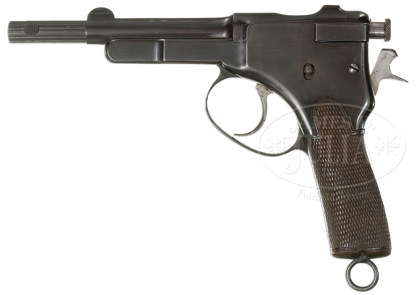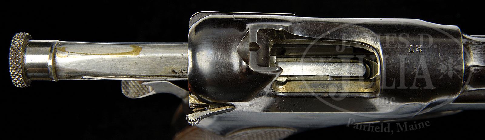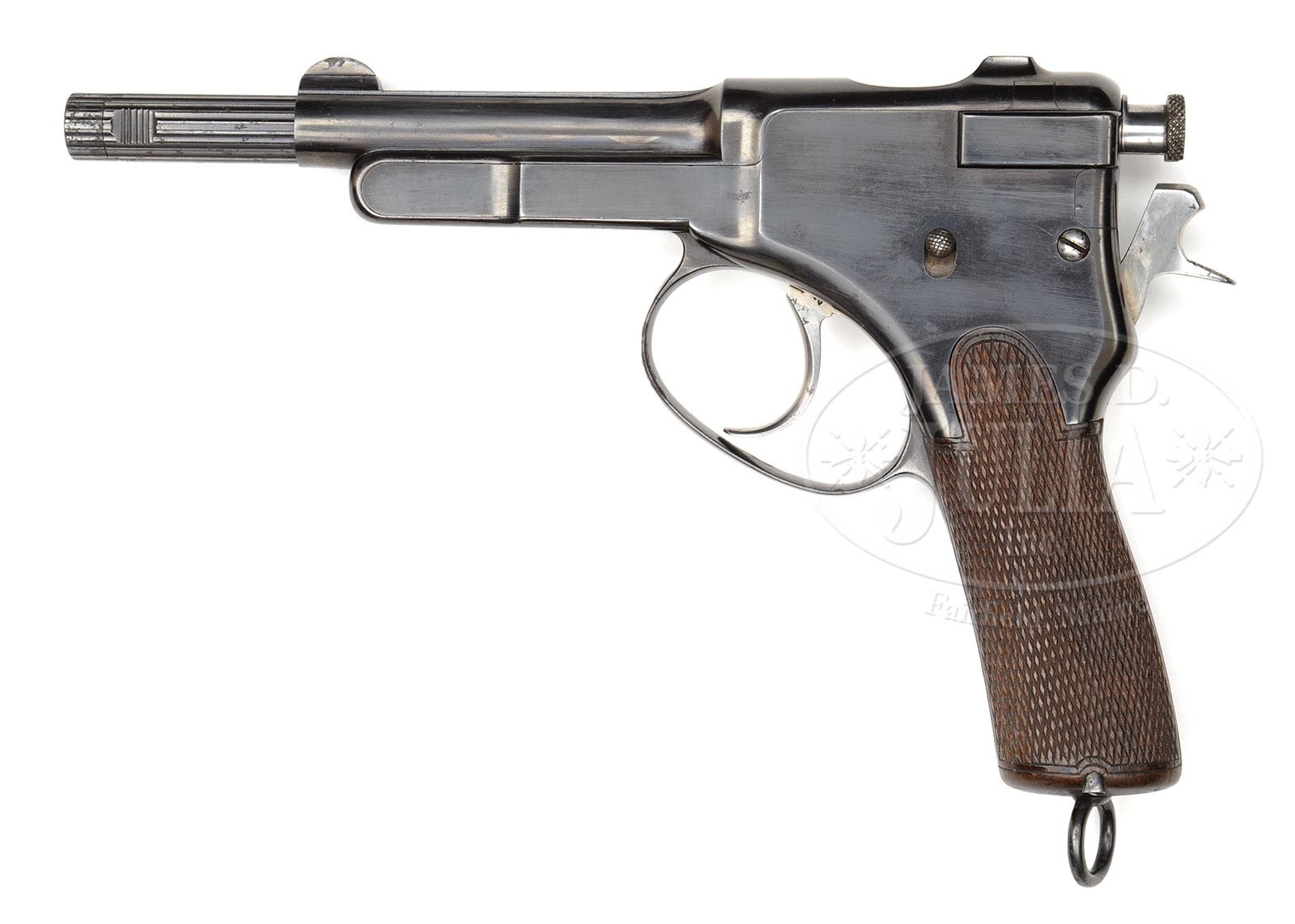 EXCEEDINGLY RARE KRNKA M1897 EXPERIMENTAL PISTOL. SN 27. Cal. 8mm. Only a handful of Krnkas are known in the collecting community. An exceedingly scarce pistol, it has been variously termed Krnka, Roth-Krnka, and most recently Roth-Theodorovich. The most commonly encountered reference is used in this description. Virtually all are different as the developers strove to construct a more reliable and easier to manufacture pistol. Pistol #8 was presented and evaluated by the Austrian military in 1897. This example, very similar to #8, has a fluted 7″ bbl that extends just over 2 inches beyond the barrel shroud. Fixed front and rear sight. The top of the rib is marked with an encircled GR monogram and the word “PATENT”. The serial number is over the chamber. The gun is blued except the bolt, bolt release, hammer and trigger. Coarsely checkered bordered grips. At the base of the frame is a heavy rotatable lanyard ring. PROVENANCE: Dr. Geoffrey Sturgess Collection, ex-Visser Collection. Pictured in the German text “Vom Ursprung der Selbsteldepistole”. CONDITION: 97% of restored blue with high point wear and occasional scattered patches of cleaned oxidation, particularly on the right side of the frame. The small parts have been lightly cleaned but all edges are sharp including the knurling at the back of the bolt stop and the checkering over the hammer. Orig well-fitting grips with minimal blunting of checkering and negligible losses. Bright bore with sharp rifling and minimal oxidation. Perfect mechanics. Even though restored, this is an extraordinary gun, suitable for the most advanced collection. 4-52454 LMA88 (25,000-35,000)