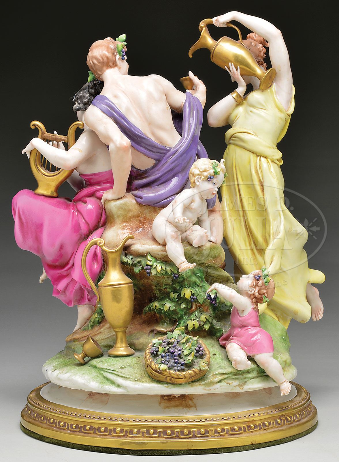 LARGE CAPODIMONTE GROUP FIGURINE. The classical scene of two women and a man with four putti. One woman in yellow pours wine into the man’s chalice, while the woman in red plays a lyre. “N” with a crown mark in blue on side, above which is an artist inscribed in porcelain, possibly “GELLE”. The figure has an integrated gold decorated base. SIZE: 15″ h x 12″ at widest. CONDITION: Very good. 9-28869 (800-1,200)