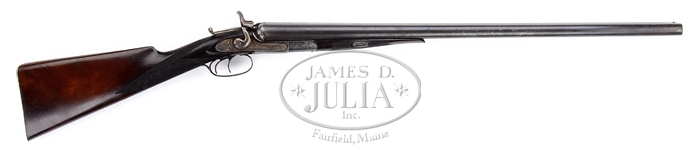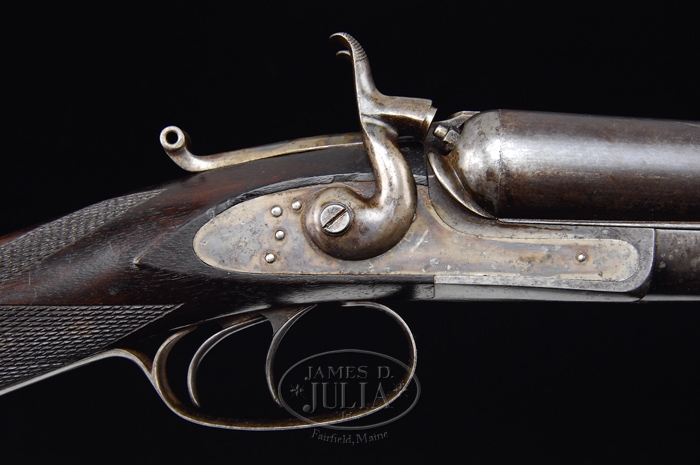 SCARCE CASED REMINGTON-WHITMORE DOUBLE BARREL SHOTGUN. SN 3750. Cal. 10 ga. Scarce shotgun with only a few thousand made in the period 1874-1882. It has 28″ steel bbls with tapered concave smooth rib & sgl bead. Rib is marked “E. REMINGTON & SONS. ILION. N.Y.” It has undecorated receiver, lockplates & hammers with a case colored lifting lever and is mounted with very nicely figured slab sawed American walnut with checkered splinter forearm secured with a sgl wedge and straight hand stock, 13-7/8″ over a smooth steel buttplate. Accompanied by an orig walnut casing with green felt lining, compartmented for shotgun & bbls, with an open compartment containing cleaning tools, a stuck shell extractor, a spring & a couple of screws. PROVENANCE: Richard Oliver Auctions; Jack Appel Collection CONDITION: Very fine. Bbls retain 65-70% thin orig blue with fine chemical spotting which, in some places, has fine pitting. Receiver retains traces of orig case colors with balance turned silver and mottled dark colors. Lockplates & hammers retain most of their orig case colors, moderately faded. Lifter opening lever retains most of its orig case colors, lightly faded. Wood is sound & crisp with minor nicks & scratches and retains about all of its orig oil finish. Mechanics are crisp, bright shiny bores with scattered light pitting. Case has a grain check in lid, otherwise is sound showing storage nicks & scratches and has had mortised lock & tenon removed. Lining is moderately faded & soiled with some moth damage. 4-59597 JR244 (2,500-4,000)