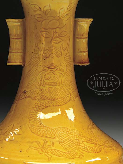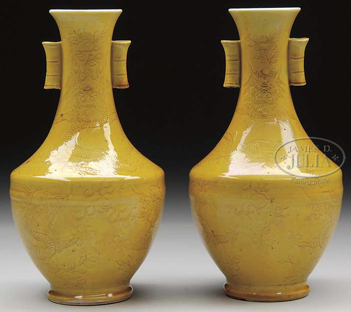 PAIR OF YELLOW ENAMEL DECORATED VASES. 19th Century China with six character K’ang Hsi rain mark (out of period) in underglaze blue. Each decorated with five-toed dragons and foliate sprays. SIZE: 9″ h. CONDITION: Good. 9-25044 (1,000-2,000)