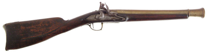 UNIDENTIFIED FLINTLOCK BLUNDERBUS. NSN. 60 Cal. 15” rnd bbl. This blunderbuss has been assembled using parts from different countries. The stock is French. The lock and bbl are of undetermined origin. The triggerguard and sideplate are roughly cast. The bbl tang does not fit the inlet in the top of the stock. CONDITION: Vise marks on the bbl. Light to moderate pitting on the lock. Stock has several cracks and some repairs. Toe of the stock is broken off and the buttplate has been folded over in this area. Mechanically functional. Wm. Hancock Collection 4-58573 (1,000-1,500)