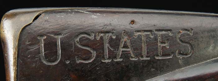 U.S. SURCHARGED FIRST MODEL BROWN BESS MUSKET WITH BAYONET. Cal. 73. NSN. 46-1/8” rnd. bbl. “TOWER” marking on lockplate is mostly removed. Faint traces of proofmarks and “U.S.” on top of breech remain on bbl. Right side of stock is heavily branded “U.STATES”. This marking does not show any wear. Ramrod and front sling swivel are modern aged replacements. 14” triangular bayonet is stamped “EN” on top flat and “WD” on socket. Bayonet slot is larger than stud on bbl. Accompanied by a booklet showing this musket on display at the Princeton Battlefield State Park. CONDITION: Smooth brown patina overall with normal handling marks. Mechanically good. 4-30812 FS19 (4,000-7,000)