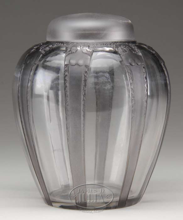 LALIQUE CARIATIDES COVERED JAR Lovely Lalique covered jar in the Cariatides pattern has wide ribs of frosted smoky gray impressed with stylized nudes. The jar is finished with a frosted dome lid. Signed on the underside with etched “R. Lalique France no. 924”. SIZE: 8″ t. CONDITION: Very good to excellent with very slight interior staining. 5-65826 (2,500-3,500)