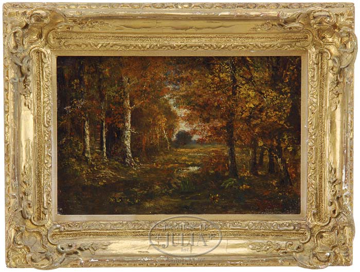 NARCISSE VIRGILE DIAZ DE LA PENA (French, 1808-1876) THE CLEARING. Oil on wood panel scene shows a clearing through woods in a late summer/early fall scene. Light cascades from the opening onto the forest floor. Signed lower right “Diaz”. Housed in a gesso decorated gilt frame. SIZE: 8″ x 12″. CONDITION: Very good. 9-95563 (1,200-1,500)