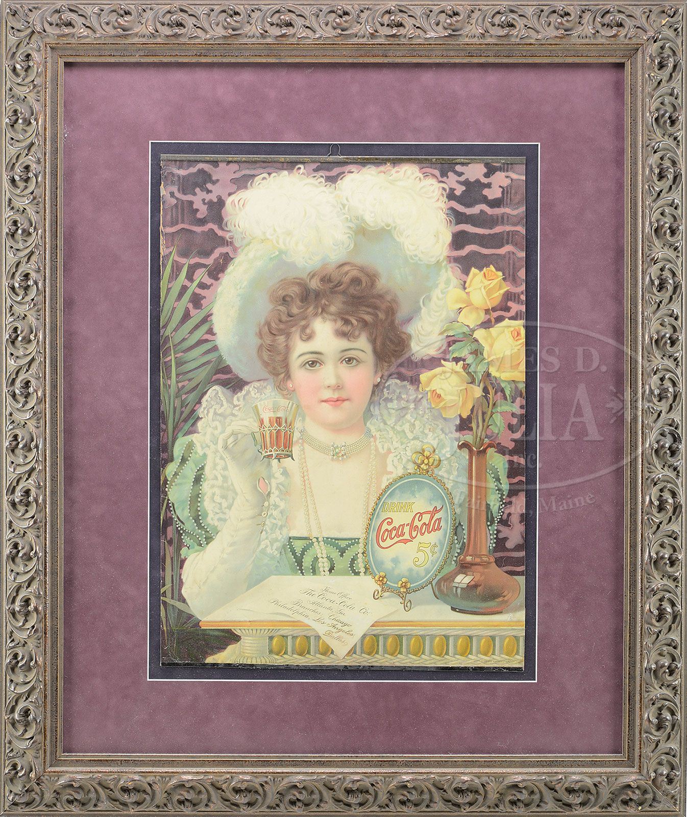 COCA-COLA 1901 PAPER SIGN. Extremely scarce early sign with illustration of elaborately attired young lass at the soda fountain. SIZE: Image size is 13-3/4″ w x 19-1/2″ t. CONDITION: This piece has had the bottom 1-3/4″ professionally replaced with a color copy of the original, and appears the metal strip has also been replaced. The right margin has been trimmed approx. 3/4″; there is some light chipping along the left edge which appears to have been trimmed 1/4″. Balance of the sign is in remarkably great condition with strong colors and just a few extremely minor spots of color touch-ups. 1-12242 (5,000-7,000) Auction: Advertising, Toy & Doll - Fall 2012 Please Note: All prices include the hammer price plus the buyer’s premium, which is paid by the buyer as part of the purchase price. The prices noted here after the auction are considered unofficial and do not become official until after the 46th day. |