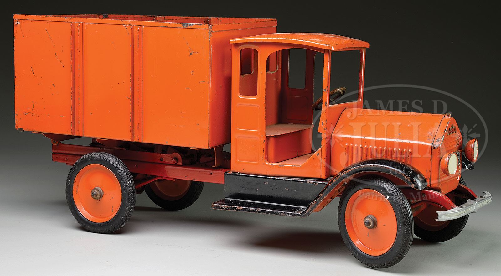STURDITOY SEGMENTED COAL DELIVERY TRUCK. An exceptional example still retaining its steel dividers, which are often missing. Obviously these trucks were intended more for commercial deliveries rather than residential deliveries. The large container body was equally divided into three sections and by means of a crank could be elevated to 45 degrees. The load could be dumped by means of a small chute in the center of the rear door or the tailgate lifted to drop the entire load. Depending upon the amount of product purchase, the buyer could have one, two, or three loads delivered. Rarely is this truck found with its dividers intact as well as the small rear chute door. Decal on rear of truck “Sturditoy Coal Company”. Toy also features nickel plated front bumper, headlights mounted to radiator with license plate #522. SIZE: 26-1/2″ l. CONDITION: Overall very good plus. 1-13086 (1,500-2,500) Auction: Advertising, Toy & Doll - June 2013 Please Note: All prices include the hammer price plus the buyer’s premium, which is paid by the buyer as part of the purchase price. The prices noted here after the auction are considered unofficial and do not become official until after the 46th day. |