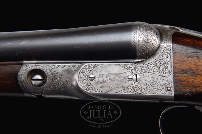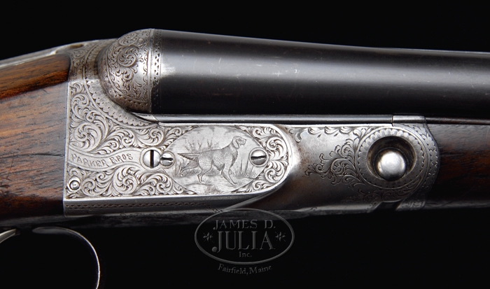 *PARKER DHE GRADE DOUBLE BARREL SHOTGUN. SN 155879. Cal. 16 ga. Built on a No. 1 frame with 30″ Titanic steel bbls choked FULL/MOD with tapered concave matted rib, dbl ivory beads, doll’s head rib extension, ejectors & dbl triggers. Receiver has typical D-grade engraving of a bird dog on each side & four ducks on floorplate all surrounded by foliate arabesque patterns with maker’s name in a ribbon on each side. Mounted with very nicely figured French walnut with checkered splinter forearm and straight hand stock with raised teardrop side panels, 14″ over an old crystallized pad. This shotgun will letter as found except for pad. Bore diameter: left – .661, right – .662. Bore restrictions: left – .026, right – .015. Wall thickness: left – .020, right – .024. Drop at heel: 2-5/8″, drop at comb: 1-1/2″. Weight: 6 lbs. 11.52 oz. CONDITION: Fine to very fine. Bbls retain 93-95% orig factory blue, slightly thinned over forearm & receiver areas. Receiver retains traces of case colors in sheltered areas being mostly silvered case colors. Stock has a miniscule hairline back of top tang, otherwise wood is sound showing moderate to heavy wear with a gouge & a couple of scratches in forearm which has a dark hand worn finish. Buttstock has a few scratches and light handling & use marks and retains about 75% orig finish. Mechanics are fine, bright shiny bores with scattered spots of pitting. 4-59838 JR272 (6,000-10,000)