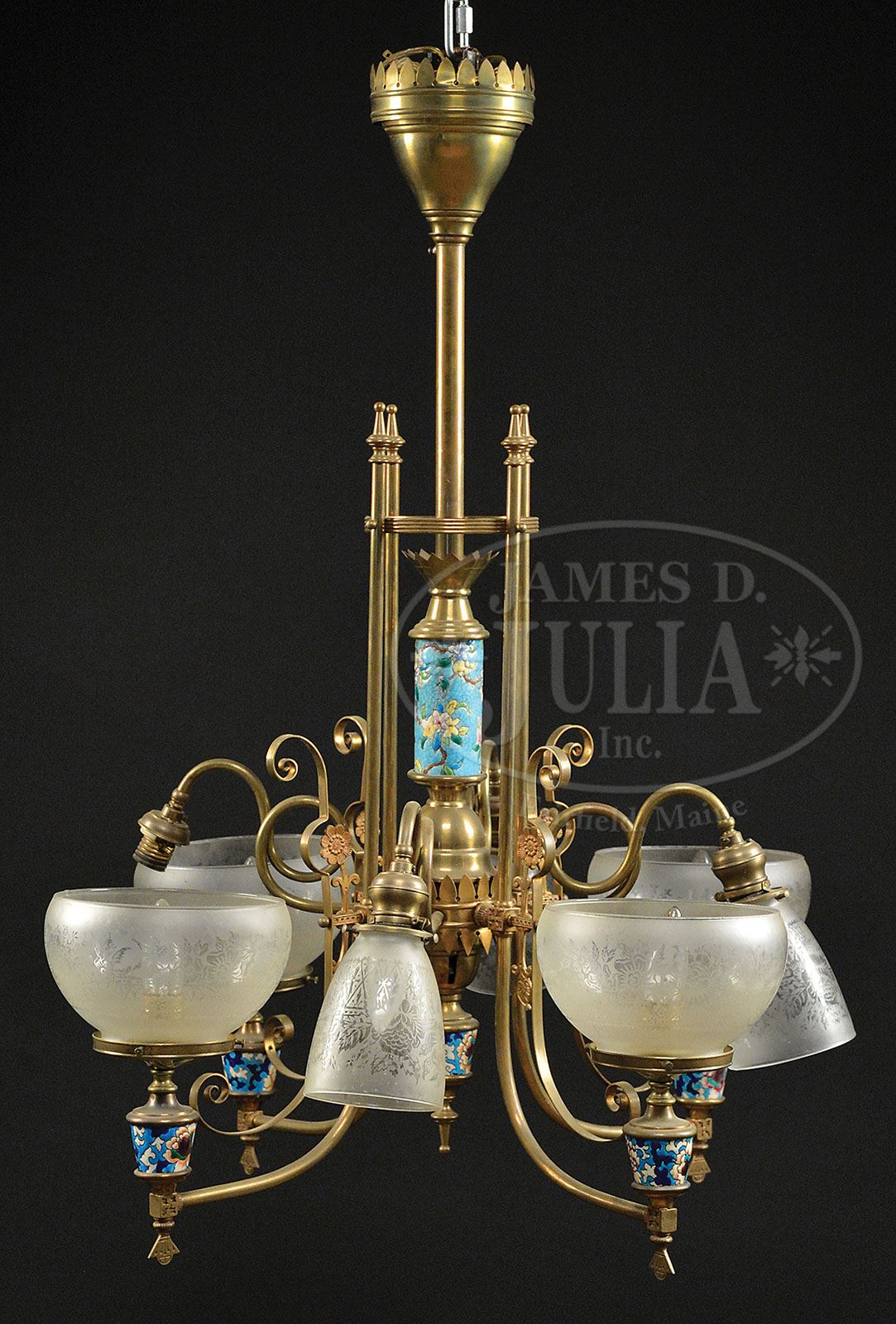 Please Note: In addition to the 3 downward facing lights with etched shades, there is a 4th arm without a shade or fitter ring. BRASS AND ENAMELED PORCELAIN SEVEN LIGHT GAS LONGWY CHANDELIER. The central shaft and four bottom fixtures having central section of flower decorated porcelain. Eastlake design with four upward facing lights having matching etched shades alternating with three downward facing lights with etched shades. Presently electrified. SIZE: 37″ h x 28″ dia. CONDITION: Very good. 9-90108 (600-900)
