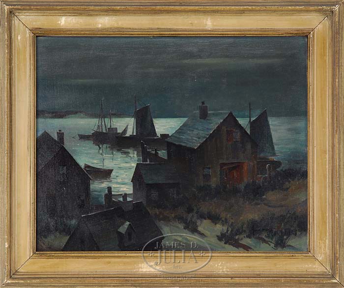 Correction: Artist should be John Cuthbert Hare (American, 1908-1978) JOHN KNOWLES HARE (American, 1884-1947) NOCTURNAL HARBOR. Oil on canvas board night time harbor scene shows boats near a dock with shoreline buildings and sand dunes beyond the harbor. Signed lower right. Housed in a period gilt molded wood frame. SIZE: 16″ x 20″. CONDITION: Very good. 9-94378 (1,000-1,500)