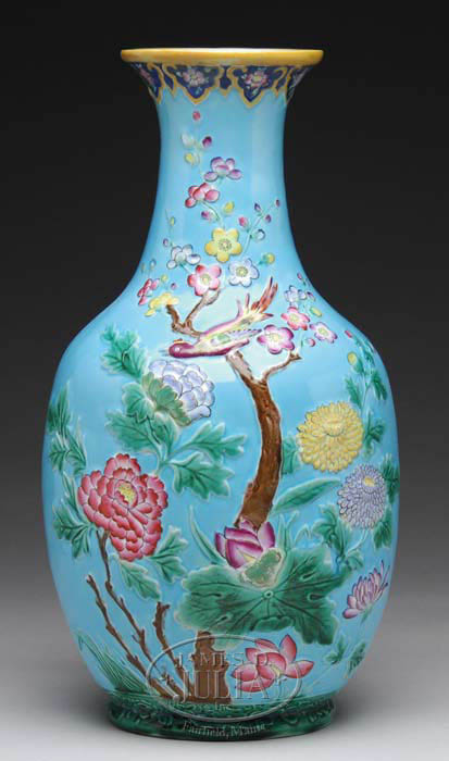 GOOD MAJOLICA TALL VASE. Blue ground vase having exotic bird with chrysanthemums and butterflies on front and back panels. Pink interior. Impress marked to bottom “Minton 203”. SIZE: 14” h. CONDITION: Very good. 9-73939 (250-400)