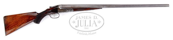 PARKER BROS. DH GRADE DOUBLE BARREL SHOTGUN. SN 87874. Cal. 12 Gauge. Built on a No. 3 frame with 30″ Damascus steel bbls choked Full/Full with tapered concaved matted rib and dolls head extension, extractors and dbl triggers. Mounted with nicely figured American walnut with checkered forend and checkered and capped pistol grip stock, 14″ over a lightly engraved skeleton style buttplate. Stock has a blank silver initial plate secured with 6 pins. Receiver is beautifully engraved with fine scrolls surrounding game scene vignettes of a pointer on left side, setter on right side and stylized game birds on the floorplate. The maker’s name appears engraved on banners located within the scrolls on each side. Bore diameter left – .732″, right – .733″, bore restrictions left – .035″, right – .033″. Wall thickness left – .038″, right – .039″. Drop at heel 2-7/8″. Drop at comb 1-3/4″. Weight 9 lb 0 oz. CONDITION: Very good. Bbls retain approx 80% brown Damascus finish with some thinning near the muzzles and carry point. Bbls ring true when struck. Receiver retains 40% case colors turning to silver with some vivid case colors showing in protected areas, the balance being a pleasing gray. Trigger bow has turned gray with only traces of blue remaining. Skeleton buttplate has areas of moderate pitting over silver/gray patina. Forend iron is gray with vibrant case colors showing internally. Wood is sound, with exception of only a minor sliver missing from the right side sharp edge of the forend. Retains approx 75% of the orig factory finish and has darkened from oil staining near the head of the stock, forend has some finish added. Numerous handling marks, scratches, and bruises are visible. Mechanics are fine. Bore is bright and shiny. 4-33587 WD12 (2,000-3,000)
