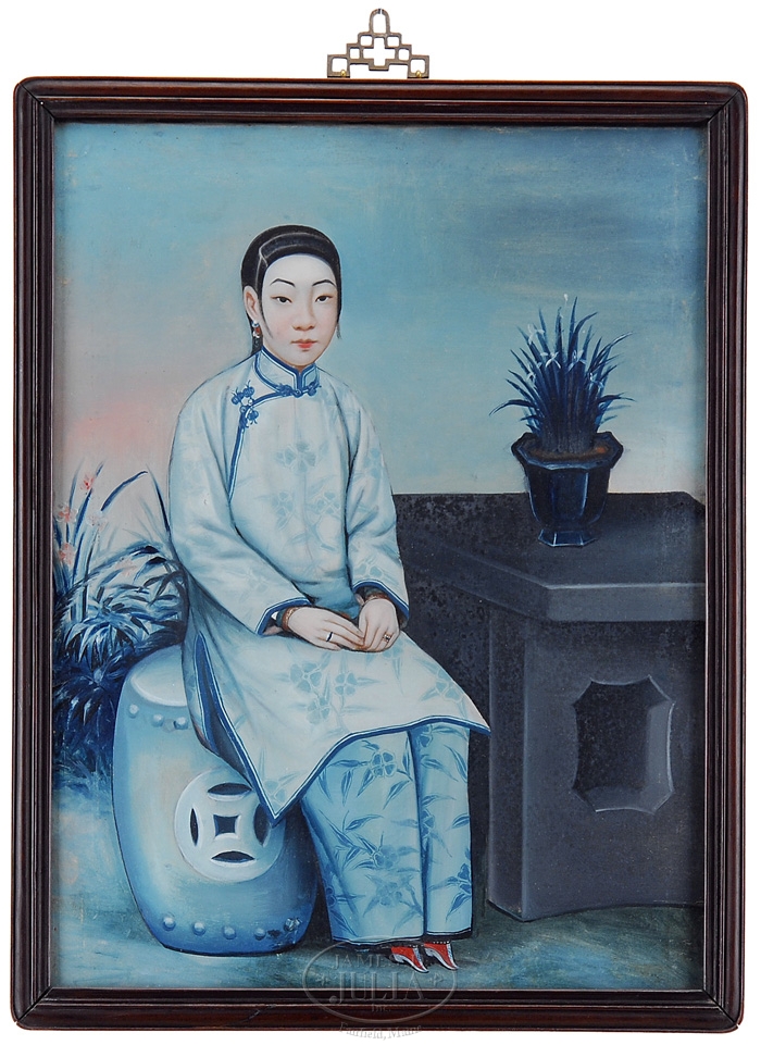 UNSIGNED (Chinese, 19th Century) PORTRAIT OF A YOUNG WOMAN. Oil on canvas Oriental portrait of a young woman in blue outfit and red slippers. She sits on a garden seat with flowers in the background and beside a planter of flowers resting on a plinth. The background in light blue to pink. Housed in a good Chinese carved hardwood frame. SIZE: Sight: 23″ x 17-1/4″. CONDITION: Very good. 9-96827 (1,200-1,800)