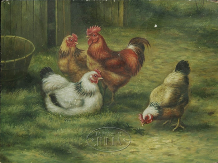 UNSIGNED (Late 20th Century) FARMYARD CHICKENS. Unsigned oil on board farmyard scene shows four chickens on short grass with water barrel and wood barn. SIZE: 12” x 16”. CONDITION: Some scratches and minor chips. Otherwise very good. 9-28450 (300-500)