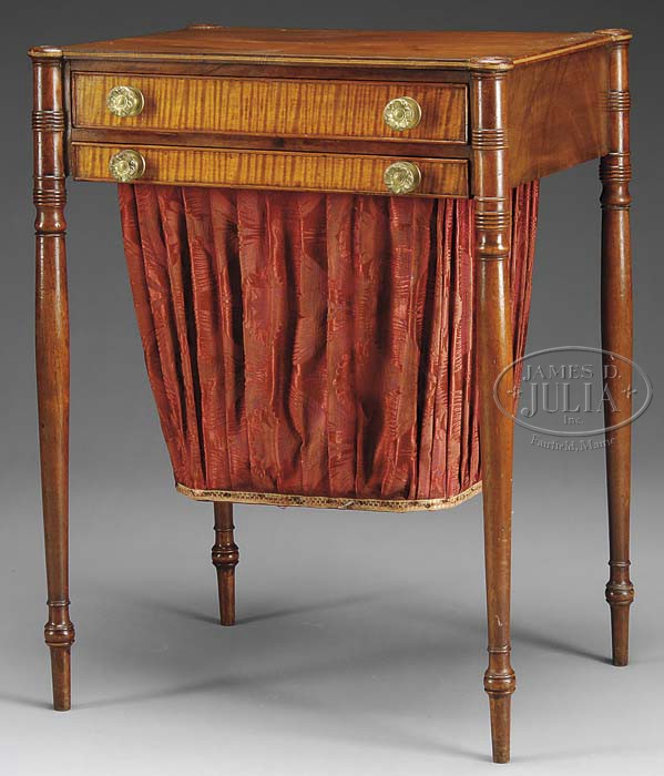 FINE NEW ENGLAND SHERATON INLAID MAHOGANY TWO DRAWER WORKTABLE. Second quarter 19th century. Probably Massachusetts. The rectangular top with molded turret corners the edges with contrasting string inlays above the conforming frieze fitted with two drawers with figured veneer panels and cockbeaded edges, the bottom drawer fitted with a silk bag. The whole raised on tapered cylindrical ring turned legs and with ring turned cuffs terminating in tapered cylindrical feet. SIZE: 29″ h x 21-1/2″ w x 16-3/4″ d. CONDITION: The top with old shrinkage cracks. Surfaces cleaned and repolished. Otherwise good. 9-22768 (2,500-3,500)