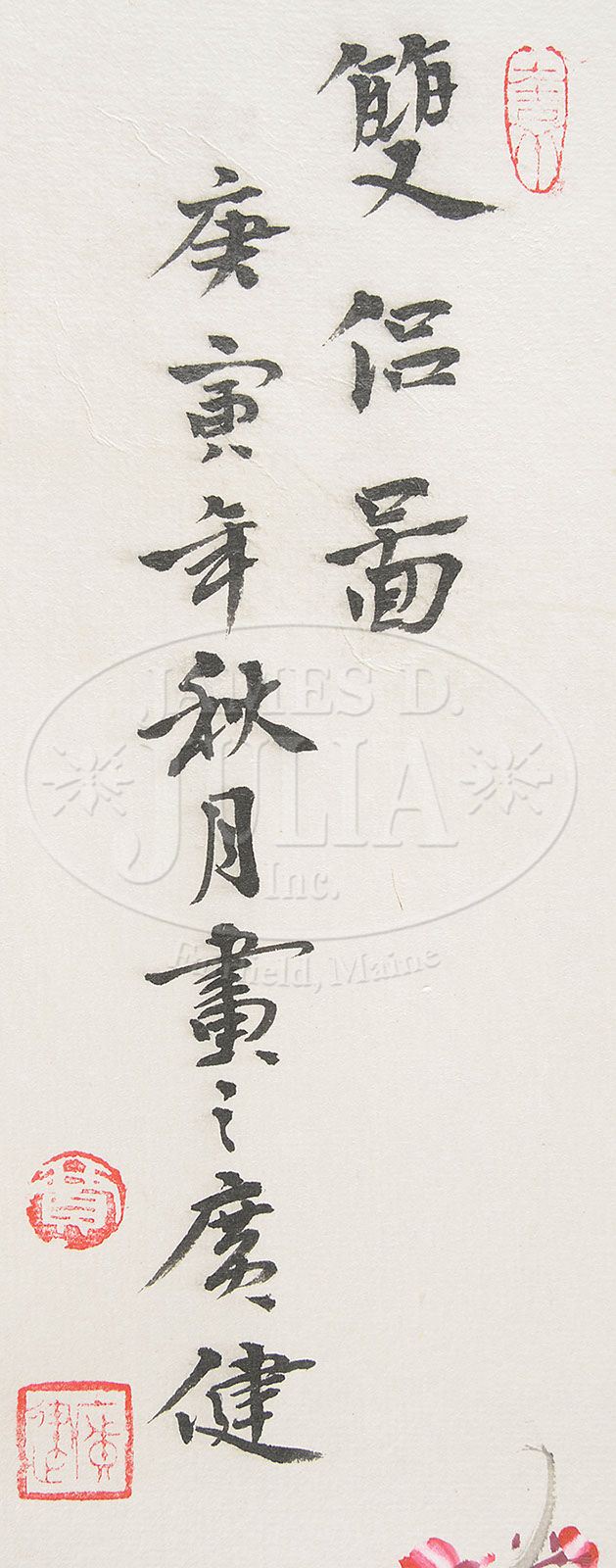 THREE HANGING SCROLLS. China, Xu Xi (b. 1940), ink and light color on paper. 1) Depicting a rainy landscape with people and cottages, signed, with one seal. 2) Fang Zengxian (b. 1931), depicting peasants carrying pole down mountain stairs, signed, dated 1979, with two seals. 3) Jiang Guangjian (b. 1964), depicting sparrows rested on prunus branches, signed, dated spring in gengyin year, with two seals. SIZE: 1) 27″ x 26-1/2″. 2) 49″ x 23″. 3) 27″ x 25″. CONDITION: Good. 9-28051 (400-600)