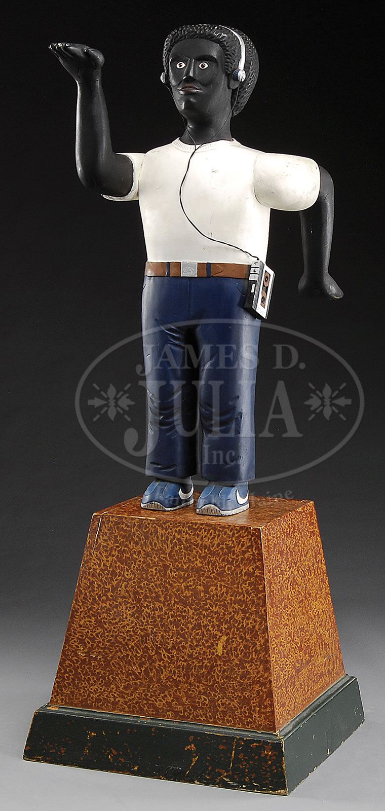 CARVED & PAINTED FIGURE “THE EGYPTIAN” BY STEVE HUNECK (1948-2010). The 41″ carved African American clothed in blue pants, white shirt, & blue and white Nike sneakers. He has a Walkman attached to his hip which leads to a pair of carved headphones. He is in the classic Egyptian style pose immortalized by the Bangles song “Walk Like an Egyptian”. He is peg mounted to a tapered column paint decorated plinth. Signed on the underside of the plinth with title, artist and dated “85” and “St. Johnsbury”. SIZE: Overall: 63″ h. CONDITION: Very good, minor scrapes & dirt. 9-27415 (1,000-2,000)