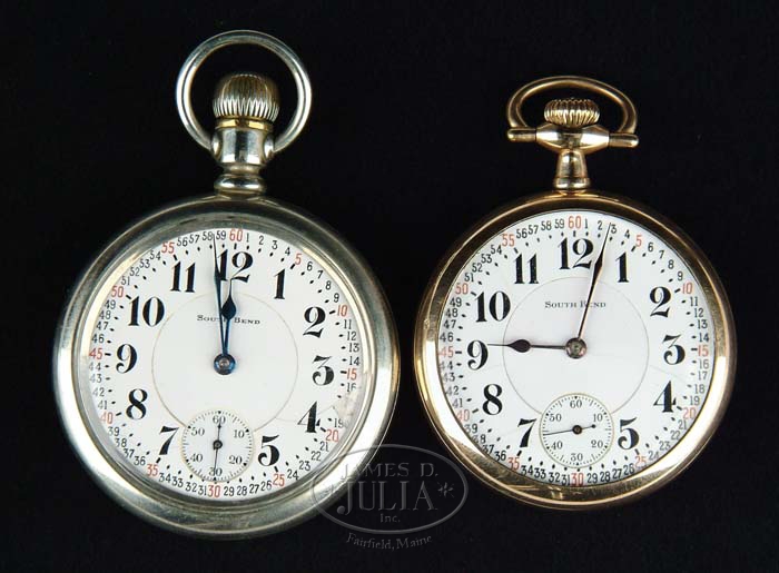 GROUP OF 2 SOUTH BEND WATCHES. 1) 16 size, 17 jewel Studebaker. Montgomery dial, with hairlines. Yellow gold filled case shows average wear. 2) 21 jewel, 16 size mod. 227. Porcelain Montgomery dial with damage. Silveroid swing out case. CONDITION: As stated above, fair. 9-70002 (400-600)