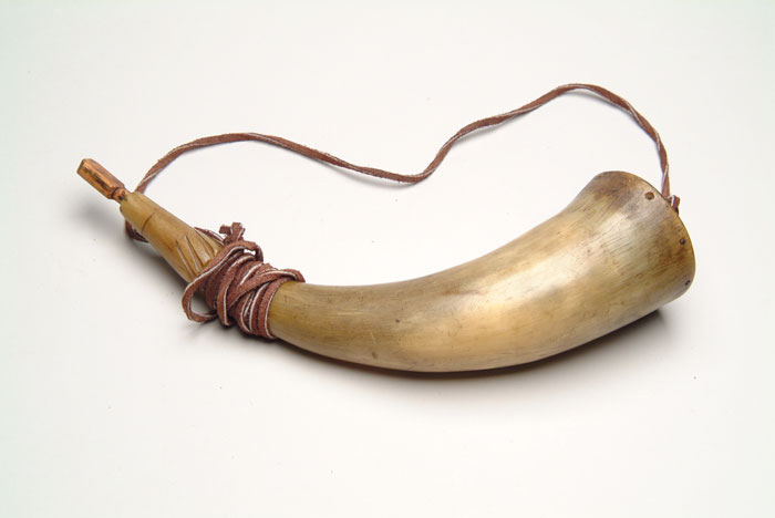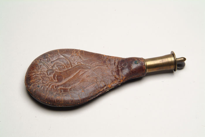 LOT OF TWELVE SHOT AND POWDER CONTAINERS. 1) 7-1/4” star and circle shotgun flask by Dixon. CONDITION: Very good with some finish remaining. Tiny dents at the base. 2) 7” hanging game shotgun flask by Sykes. Several shallow dents on both sides but retains about half of the finish and the hanging strap. 3) 8” leather Dixon shotgun flask. Fine. 4) Unidentified 6-1/2” leather 4 lbs. shot container. Lightly scuffed still solid. 5) Leather 6-12” hanging game 1 lb. shot flask. Good condition, slight scuffing. 6) 5-1/2” shot flask with scoop. Seams are open. 7) Dbl leather shot container, shoulder straps missing. Leather cracked and split. 8) 6-1/2” horn with rifle tip. Fine. 9) 4-3/4” horn with flat cap and staple. Wooden stopper. Good with slight crack at tip. 10) 7” horn with wood stopper and base. Good. 11) 9” horn with wood stopper and slightly domed base. 12) 12” horn with wood stopper and slightly domed base. 4-59481 FS-715 (500-800)