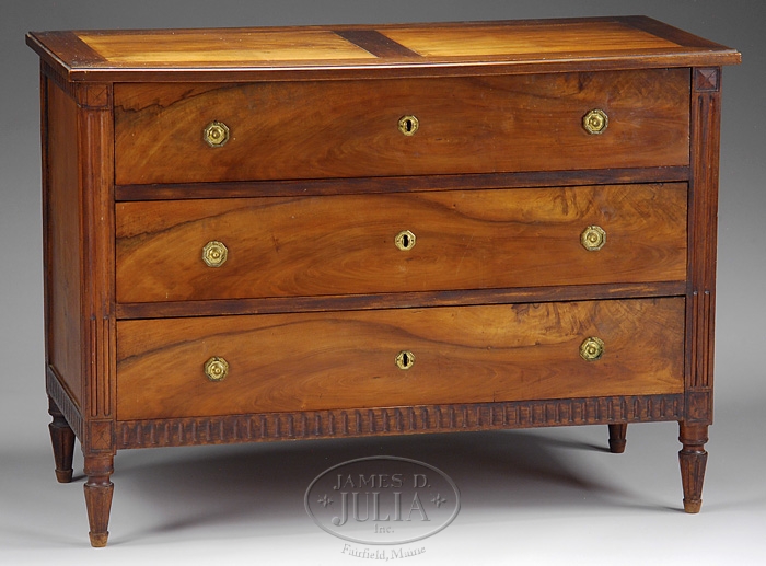 FINE LOUIS XVI WALNUT COMMODE. Last quarter 18th century. The rectangular paneled top with molded edge above the conforming case with stop-fluted pilasters centering three long drawers, the case apron fluted, the ends paneled, raised on tapering, cylindrical, fluted, ring-turned feet. SIZE: 32″ h. x 44-1/2″ x 20″ d. CONDITION: Drawers are warped concavely, otherwise good overall condition, retaining old hardware. No restorations noted. 9-95616 (1,000-2,000)