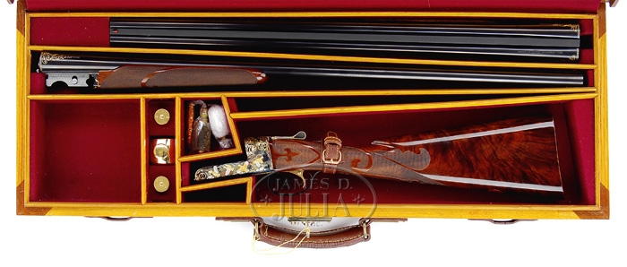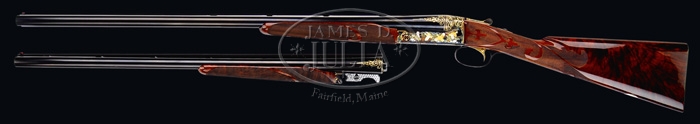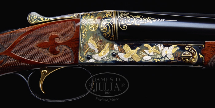 *CASED CONNECTICUT SHOTGUN COMPANY PRESENTATION GRADE WINCHESTER MODEL 21 DOUBLE BARREL SHOTGUN 2-BARREL SET. SN W38516. Cal. 12 ga. Phenomenally elaborate 21 with 26″ bbls (#1) choked MOD/IMP-CYL and 30″ bbls (#2) choked FULL/MOD. Both sets of bbls have flat, matted, tapered, ventilated ribs with Bradley red ivory beads, ejectors & gold plated Winchester sgl selective trigger. Both sets of bbls have 3″ chambers. Receiver is beautifully, classically case colored with extraordinarily detailed multi-colored gold & platinum inlays with a flight of four bobwhite quail on left side & five ruffed grouse on right side with seven mallard ducks on bottom and a fabulous pheasant on trigger bow with a dove on opening lever pivot. All of scenes have clouds in background and various flora in foregrounds. Top of receiver & all appended metal has a plethora of gold wire inlay which extends 2-1/4″ up over chamber areas of bbls, which also have two gold bands at breech ends. Mounted with extremely beautiful center feather crotch American walnut with deep “B” carving on both black insert beavertail forearms and straight hand stock which is 14-3/8″ over a matching “B” carved and checkered butt. Accompanied by a spectacular, burgundy felt lined, oak & leather trunk case compartmented in bottom for shotgun & both sets of bbls with gold plated snap caps, a square oil bottle, a 2-pc ebony & brass cleaning rod & implements. Case has its tan canvas & leather cover. #1 BBLS: Bore diameter: left – .738, right – .738. Bore restrictions: left – .016, right – .010. Wall thickness: left – .025, right – .028. #2 BBLS: Bore diameter: left – .728, right – .728. Bore restrictions: left – .038, right – .020. Wall thickness: left – .033, right – .035. Drop at heel: 1-1/2″, drop at comb: 1-1/4″. Weight with #1 Bbls: 7 lbs. 2.24 oz. CONDITION: Exceptionally fine, as new. May have been fired, but if so very little. Retains virtually all of its orig factory finish to all various parts. Receiver has a couple of small scratches in shellac covering and there are a couple of small scratches in finish on buttstock with two or three small chips in finish on butt. Mechanics are crisp, bright shiny bores. Case is equally new. 4-32802 JR290 (17,500-27,500)