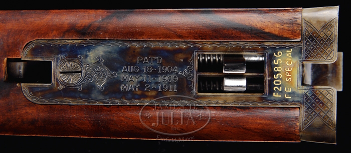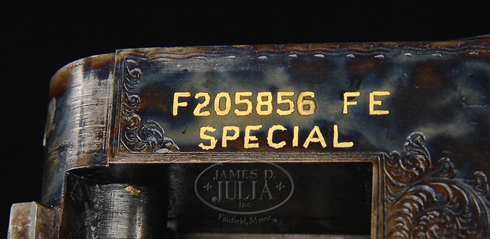 *CASED CONNECTICUT SHOTGUN MFG. CO. FOX FE SPECIAL GRADE DBL BBL SHOTGUN. SN F205856. Cal. 410. Fabulous CS Mfg. Co. shotgun with 28″ bbls, choked FULL/FULL with tapered, concave matted rib, single ivory bead, cross bolt rib extension, ejectors and gold plated dbl triggers. Right bbl is inlaid in gold “MADE TO ORDER AH FOX” and left bbl “KRUPP FLUID STEEL”. There are narrow gold bands at muzzle and chamber ends and a gold band on rib. Bbl flats are inlaid in gold “FE SPECIAL / F205856”. Mounted with highly figured and colorful Circassian walnut with fleur de lis carved and checkered, black insert schnable tipped forend, carved and checkered straight grip stock, 14-1/2″ over carved and checkered butt. Receiver and appended metal are beautifully engraved by A. Tuscano and signed on trigger plate. It has full coverage, extremely fine foliate arabesque patterns with extremely well executed gold ruff grouse on left side, gold quail on right and gold woodcock on bottom front of receiver. Each side of receiver has makers name in gold and end of hinge pin and pivot of top lever have four gold diamonds. Floor plate screw and trigger guard vignette have scalloped gold wire borders. Top tang has “S” in gold and SN on bottom tang is also in gold, water table has SN and “FE SPECIAL” in gold and water table also has very beautiful engraving pattern. Accompanied by a CS Mfg. Co. green felt lined oak and leather trunk case with label in lid and is compartmented for shotgun, snap caps, oil bottle, turn screws, 2-pc brass cleaning rod and three covered compartments. It also has its original canvas cover. CONDITION: Extremely fine. Has been fired, but very little and virtually retains all of its brilliant original factory finish on both metal and wood. There are a few very minor and light dents on buttstock. Case is in equally fine condition. 4-32843 BT108 (22,500-32,500)