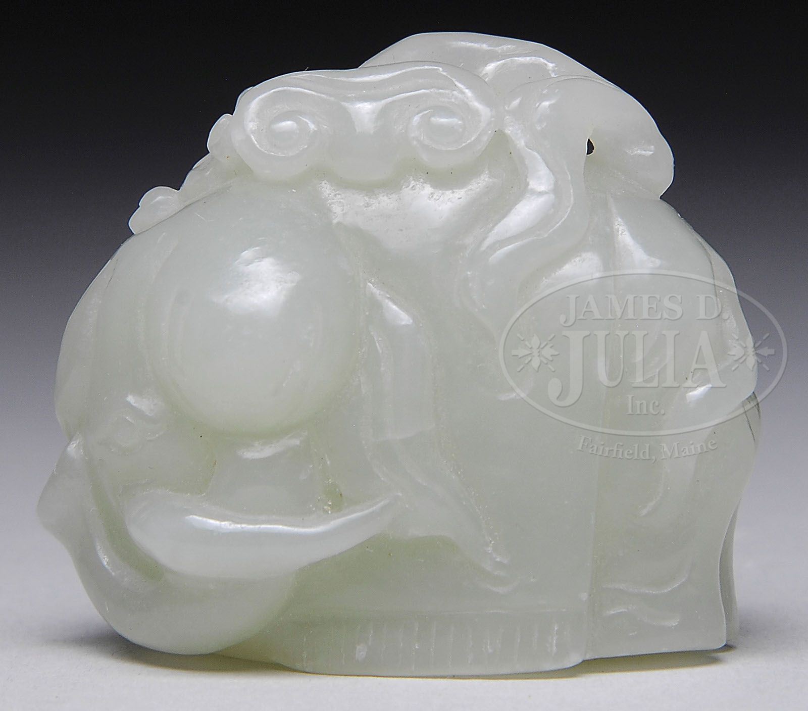 JADE CARVING. 20th century, China. Stone of a yellowish celadon color. Carved as a caparisoned elephant. SIZE: 1-1/2″ h x 2-1/2″ l. CONDITION: Very good. 9-28006 (200-300)