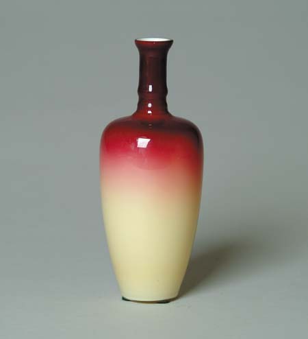 WHEELING PEACH BLOW MORGAN VASE. Very nice Wheeling Morgan vase has rich deep fuschia color at top shading to amber at bottom with nice color separation. Vase does not have griffin base. SIZE: 7-3/4″ t. CONDITION: Several tiny fleabites to rim, otherwise very good to excellent. 5-70211 (900-1,100)