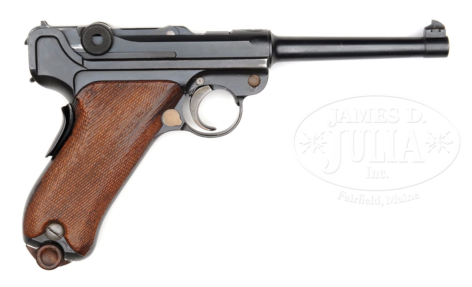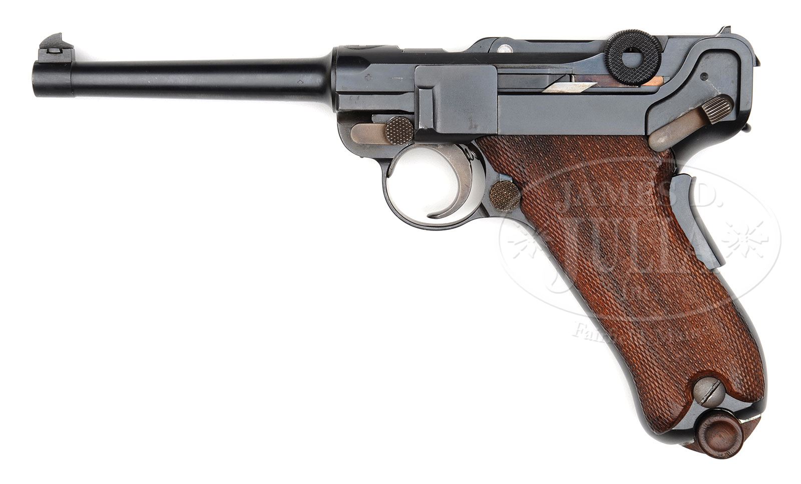 *◊ VERY RARE DWM/WAFFENFABRIK BERN 1906 SWISS CROSS IN SHIELD TRANSITIONAL PROTOTYPE LUGER. SN 26. 4-3/4″ 30 Cal. bbl. DWM made frame etc. and receiver marked with Swiss cross in shield above chamber. “WAFFENFABRIK BERN” marked on center toggle link produced by the W+F. Swiss + and BP proofs. Frame is numbered internally in front of the takedown lever. All numbered parts are matching except for the grip safety which has #74. Most small parts have no numbers. Original Swiss plain wood bottom magazine. Grip safety. Checkered walnut grips. Trigger bearing in frame and sideplate and sear spring modified to improve trigger pull, which is exceptionally light and crisp, to evaluate modifications for W+F production, which commenced during WWI. This gun is featured in Dr. Geoffrey Sturgess’ The Borchardt & Luger Automatic Pistols. An extremely rare Swiss variation. PROVENANCE: Collection of Dr. Geoffrey Sturgess. CONDITION: Very fine retaining 95% original blue. Straw is about 70% and appears to have been reheated in the past. Bore is bright and sharp. Grips are worn and the right grip appears to have a repaired crack in the upper right. Magazine is excellent. Mechanics are sound. 4-52839 BWS56 (5,000-10,000)