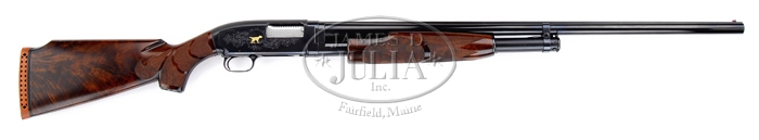 *CUSTOM ENGRAVED PIGEON GRADE TRAP WINCHESTER MODEL 12 PUMP SHOTGUN SN 1261080. Cal. 12 ga. Usual configuration 30″ 2-3/4 chamber, solid rib, full choke bbl with sgl red Bradley sighting bead. Receiver is engraved in a Winchester 12-1B pattern with gold setters. Engraving is reminiscent of former factory engraver Pauline Murrell. Both bolt and carrier are jeweled and pigeon engraved on magazine tube extension. Mounted with A-carved fancy American walnut with pistol grip Monte Carlo stock with 14-1/2″ pull over Winchester vented pad and usual shaped trap beavertail forend. Bore restrictions: -.032 Wall thickness: -.041 . Bore diameter: -.729. Drop at heel: 1-1/4, drop at comb: 1-1/4 MC. Weight 8 lbs, 6 oz. CONDITION: Very fine with 98% of its factory quality restored finish. The only wear appears to be on the sharp edges of slide bar being worked to function the action. The wood is sound with only the lightest of handling marks. Mechanics are crisp, bore is bright and shiny. 4-59851 BT35 (2,000-3,000)
