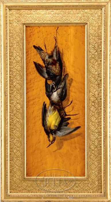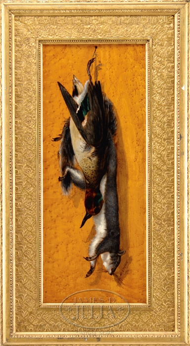 PAIR OF OIL ON BIRDSEYE PANEL PAINTINGS OF DEAD GAME BY MEYER STRAUSS. Both paintings very nicely done; the first depicts a quail, a snipe and a meadowlark, the second a green wing teal and gray squirrel. Both are framed in matching, gessoed, gold Victorian frames and each are signed “M. STRAUSS” and dated [birds – 1878; squirrel (very faintly but appears to be) 1894] in lower right. SIZE: 31-1/4″h x 17-1/4″w each. CONDITION: Generally excellent. Both panels slightly bowed. Frames w/minor imperfections. 4-32942 JJ5 (2,750-3,750)