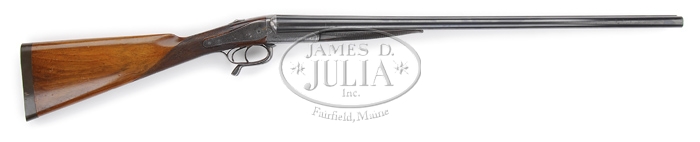 UNUSUAL CHARLES LANCASTER UNDERLEVER DOUBLE BARREL SHOTGUN. SN 4923. Cal. 12 ga. Fine English dbl with 28″ bbls choked FULL/IMP-CYL with tapered concave smooth rib, sgl bead, extractor, dbl underbites & dbl triggers. It has a rounded action with unusual back action peninsula sidelocks with cocked indicators that cock with opening lever. It has a top tang mounted thumb safety. Receiver, lockplates & appended metal have about 80% coverage fine English foliate arabesque patterns with “CHARLES LANCASTER’S PATENT” on both sides of receiver and “LANCASTER / PATENT LONDON” in two ribbons on each lockplate. Each lockplate has “COK’D” in gold & top tang has “SAFE” in gold. Mounted with nicely figured English walnut with checkered splinter forearm & straight hand stock, 15-1/4″ over a thick hard-rubber buttplate. It has a blank silver initial oval on bottom. Bbl flats have nitro proofs to 3-1/4 tons and are marked 2-3/4″. Bore diameter: left – .726, right – .726. Bore restrictions: left – .028, right – .008. Wall thickness: left – .038, right – .031. Drop at heel: 1-3/4″, drop at comb: 1-1/4″. Weight: 6 lbs. 13.44 oz. CONDITION: Very good to fine. Bbls retain most of a fine English style rust blue with only slight muzzle edge wear and chamber end edge wear. Receiver, lockplates, top & bottom tangs are a cleaned silver metal color with bottom tang showing heavy wear. Wood is sound with a hairline & a chip at back edge of forearm and buttstock with minor nicks & scratches. Forearm retains a dark orig hand worn finish and buttstock retains about all of a professionally restored finished from checkering back and is a substantially lighter color. Mechanics are fine, bright shiny bores. 4-59874 JR265 (2,500-3,500)