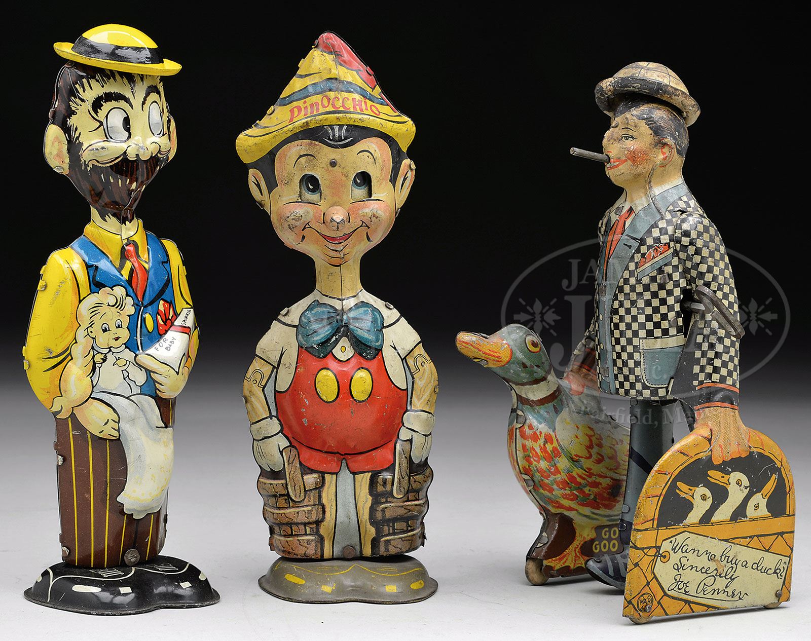 PINOCCHIO, B. O. PLENTY, AND JOE PENNER WINDUPS. Lot includes a moving eye version of the Marx Pinocchio Walker, Copyright 1939 WDE. Dick Tracy character B. O. Plenty is shown as a tin figured windup walker by Marx, Copyright Famous Artist Syndicate, Chicago. Joe Penner windup by Marx shows character walking with tipping hat and moving cigar. Holds Goo Goo the duck to one side and basket of ducks in other hand. SIZE: Tallest 9″. CONDITION: Pinocchio shows overall soiling – working. B. O. Plenty has replaced hat, otherwise clean and working. Joe Penner is good and working with overall soiling. 1-13329 (400-600) Auction: Advertising, Toy & Doll - Fall 2013 Please Note: All prices include the hammer price plus the buyer’s premium, which is paid by the buyer as part of the purchase price. The prices noted here after the auction are considered unofficial and do not become official until after the 46th day. |