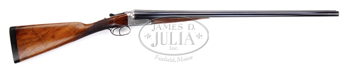 *G.E. LEWIS & SONS DOUBLE BARREL SHOTGUN. SN 10835. Cal. 12 ga. Fine English dbl with 28″ steel bbls choked MOD/IMP-CYL with tapered concave smooth rib, sgl bead, extractor, dbl underbite & dbl triggers. It has maker’s name & address on rib. Bbl flats show nitro proofs to 1-1/8″ oz. and 3 tons and is marked 2-1/2″. Chambers measures 2-3/4″. Flats are also marked “SLEEVED” but no evidence shows that bbls are sleeved, a magnificent job. Boxlock receiver is nicely engraved with about 40% coverage foliate arabesque patterns & maker’s name on each side. Mounted with nicely figured English walnut with horn tip insert, checkered splinter forearm & straight hand stock with raised side panels, 15″ over a thick hard rubber buttplate. It has a blank silver oval initial plate on bottom. Bore diameter: left – .727, right – .728. Bore restrictions: left – .024, right – .015. Wall thickness: left – .034, right – .039. Drop at heel: 2″, drop at comb: 1-1/2″. Weight: 6 lbs. 10.88 oz . CONDITION: Fine. Bbls retain about all of a beautiful bright English style rust blue. Receiver & top tang are cleaned bright metal with floorplate & trigger guard a restored blue showing moderate to heavy wear. Wood is sound with a small chip missing from edge of forearm and has light handling & use marks and retains most of an old restored finish with freshened checkering. Mechanics are fine, bright shiny bores. 4-59868 JR263 (1,500-2,500)