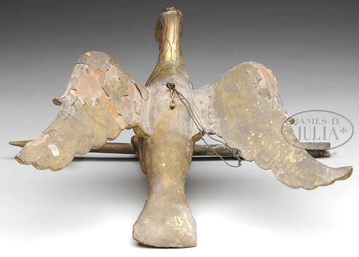 GERMANIC CARVED AND GILT DECORATED EAGLE. Second half 19th century, Eastern Europe. This nice small pine example of a stylized eagle in flight clutching an arrow in its talons. The eagle carved from the solid with applied wings. SIZE: 16″ l x 18″ w (overall). PROVENANCE: From a fine Maine home. CONDITION: Retains original gilded surfaces with minor losses. Well delineated plumage. Small stress cracks in legs. Old repair to proper right wing at body and loss to proper left wing tip. 9-21917 (1,500-2,500)