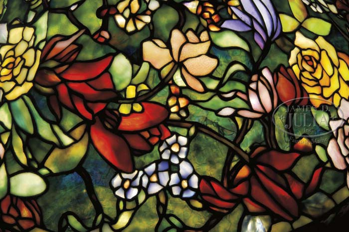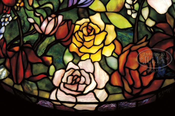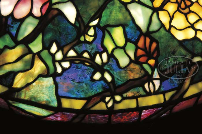 CONTEMPORARY PORCELLI STUDIOS LEADED LAMP. Outstanding Huysum floral bouquet leaded lamp is inspired by the floral bouquet paintings of Jan van Huysum. Shade depicts an allover floral bouquet of numerous types of flowers done in rich colors of blue, purple, lavender, yellow against a shaded green background. Shade rests atop a decorative bronze base with impressed berry and leaf design around the foot and shoulder. Base is topped with a four socket cluster and finished with a mottled green patina. SIZE: Shade is 22″ dia. Lamp is 25-1/2″ t. CONDITION: Very good to excellent. 5-63614 (10,000-15,000)