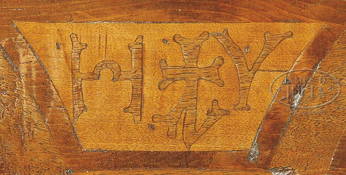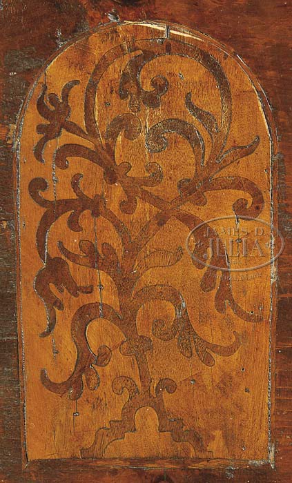 LARGE CONTINENTAL MARQUETRY WALNUT CASSONE. Dated 1648 and with monogram, probably Italian. Rectangular pine lid with picture frame molding mounted with original iron strap hinges above conforming case, front with alignment of four arched recessed panels of trompe l’oeil design echoing the design of the alternating flat molded columns. Each arch centered with conforming arch of marquetry vinery. Each column centering rectangular marquetry panel. All above a scalloped apron flanked by large bracket feet. SIZE: 33-1/2″ h x 81″ l overall x 25″ d. PROVENANCE: From a Bar Harbor, Maine home. CONDITION: Hardware original. Restoration to feet. Surfaces with old cleaning, now somewhat opaque. 9-23359 (1,200-1,800)
