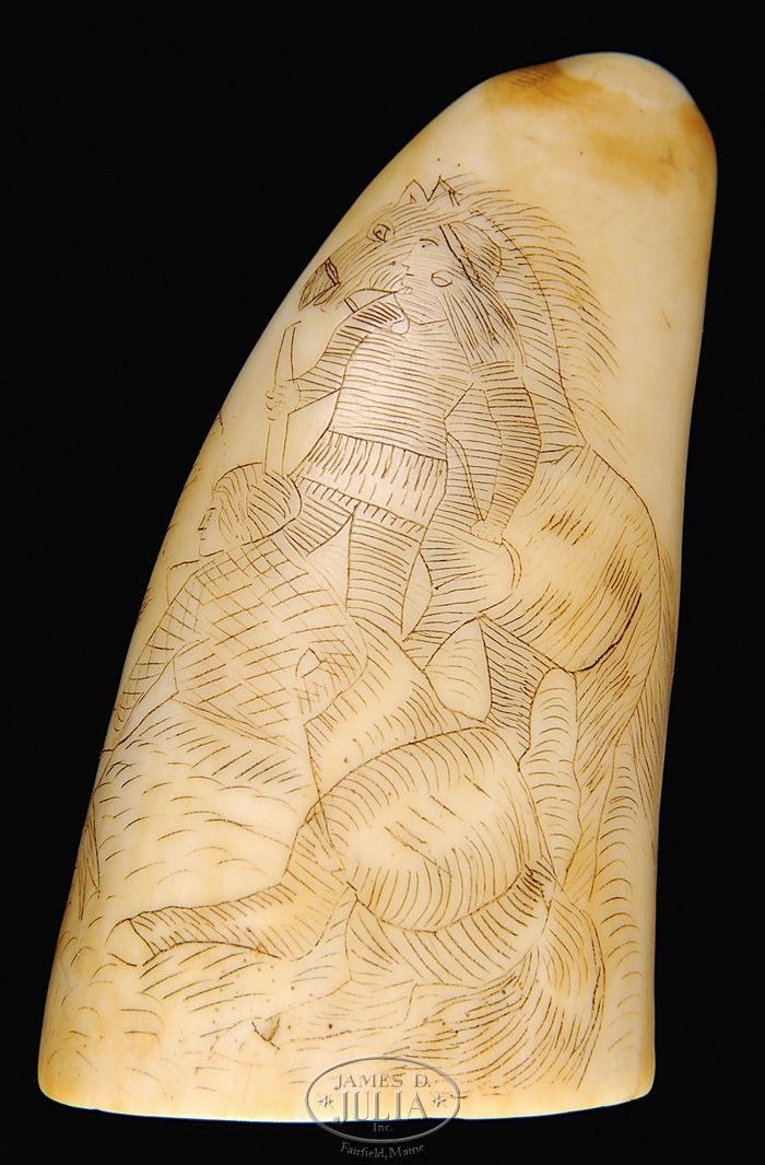 FINE DIMINUTIVE SCRIMSHAWED TOOTH. Circa 1813. This small two sided example depicting two Native American figures, with horses, one horse and rider standing and second individual and horse positioned on the ground. Reverse showing a displayed eagle with 16 star American flag, a banner clutched in his beak engraved “FLAG OF OUR US” beneath a rayed sun with face. The polished base of the tooth with the incised initials “JJ” over the date “1813”. SIZE: Ht 3″ CONDITION: Very good original condition with nice color and patina. 9-96978 (1,000-1,500)