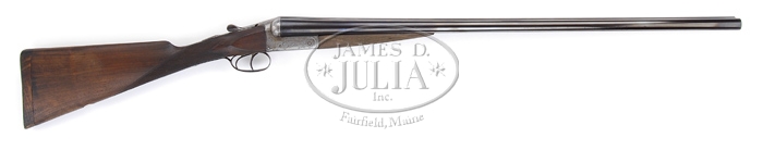 *CASED C&A WESTON DOUBLE BARREL SHOTGUN. SN 7876. Cal. 12 ga. Fine English dbl with 30″ steel bbls choked FULL/IMP-CYL with tapered concave smooth rib, sgl bead, extractor, with dbl underbites & dbl triggers and 2-1/2″ chambers with nitro proofs on flats. It has boxlock receiver that is lightly engraved with about 40% coverage foliate arabesque patterns & maker’s name on each side. Appended metal is engraved to match. Mounted with straight grain English walnut with checkered splinter forearm, missing its tip insert & straight hand stock with raised side panels, 15″ over a thick serrated wood extension. It has a blank silver oval initial plate on bottom. Accompanied by its orig red felt lined, leather trunk case with initials “D.G.D.” embossed on lid. It has maker’s label inside lid and is compartmented in bottom for shotgun & various parts. Bore diameter: left – .727, right – .730. Bore restrictions: left – .029, right – .006. Wall thickness: left – .036, right – .027. Drop at heel: 1-3/4″, drop at comb: 1-3/8″. Weight: 6 lbs. 15.36 oz. CONDITION: Good to very good. Bbls retain most of a professionally restored finish with several small spots of pitting on outside. Receiver & appended metal are a cleaned metal color with traces of case colors on trigger plate & top tang. Forearm, with its missing insert, has a grain check around center medallion and is slightly shrunken with no finish in preparation for restoring. Stock has a chip back of top tang, otherwise is sound with freshened checkering and retains most of a restored finish. Mechanics are fine, bright shiny bores with a few scattered spots of pitting. Case shows moderate to heavy wear, missing one strap with damaged latch and heavily faded & soiled inside. 4-59885 JR239 (1,500-2,500)