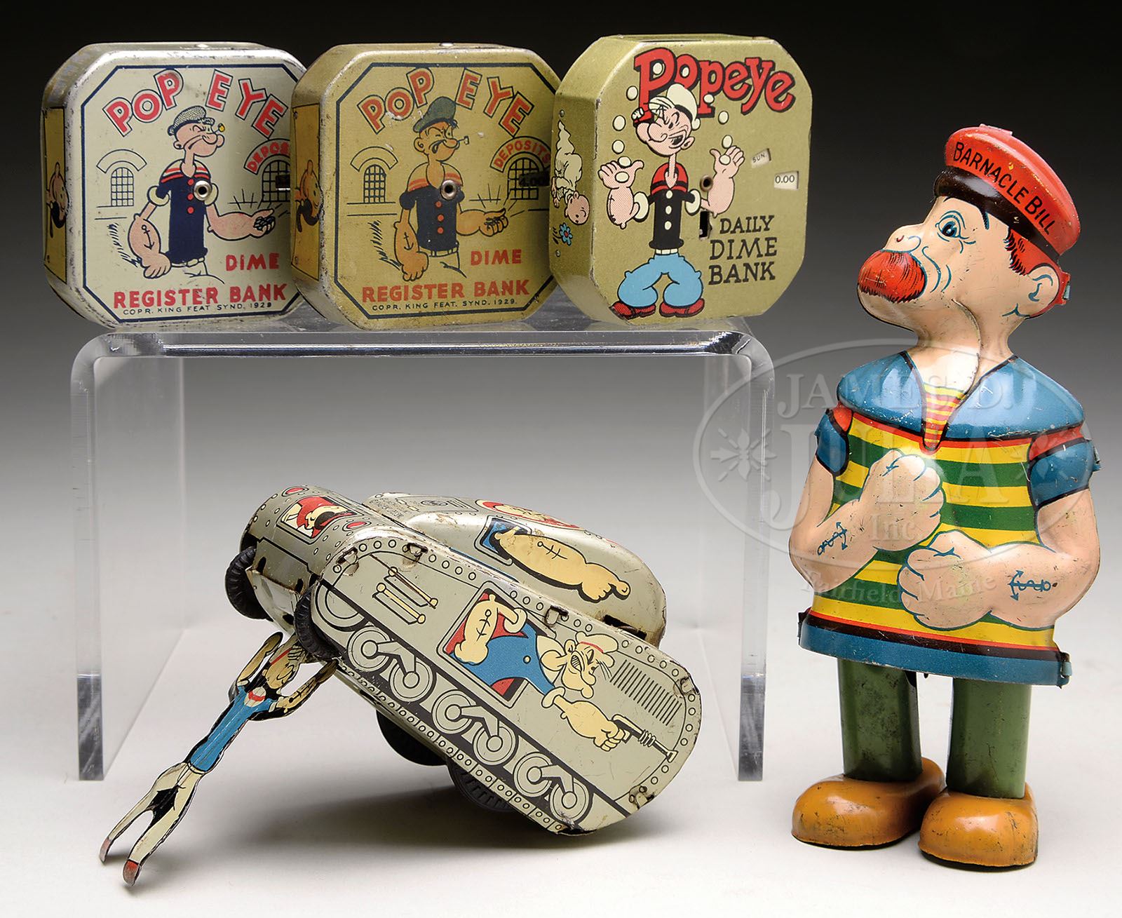 POPEYE TIN TOY LOT. 1) Popeye Turn Over Tank by Linemar, Japan (Marx) Copyright King Features Syndicate. All tin toy tank rolls forward with wind up action showing lithographed characters from Popeye comic strip. Tin flat figure of Popeye below, lifts and turns over tank. 2) Barnacle Bill tin wind up figure by Chein. This was the same Sailor toy that was used for Popeye with different colors and graphics. 3, 4, & 5) Three different graphic variations of Popeye’s Daily Dime Bank. Copyright 1929 King Features Syndicate. Perimeter shows three different characters from comic strip. Insert dime and tally shows. Bank opens when tally reaches $5. SIZE: Largest 6-12″ t. CONDITION: Turn over tank mechanism is sluggish, otherwise toys are clean and working. 1-13276 (250-450) Auction: Advertising, Toy & Doll - Fall 2013 Please Note: All prices include the hammer price plus the buyer’s premium, which is paid by the buyer as part of the purchase price. The prices noted here after the auction are considered unofficial and do not become official until after the 46th day. |
