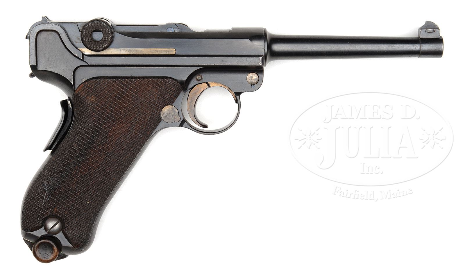 *◊ BRAZILIAN DWM 1906 LUGER. SN 1423. 4-3/4″ 30 Cal. bbl. “DWM” scroll on center toggle link. Circle “B” Brazilian proof on left side of receiver. Grip safety. Checkered walnut grips. Wood bottom magazine with very faint numbers that do not match. These guns were produced in late 1909/early 1910. This gun is featured on pp. 561, 571, 606 of Dr. Geoffrey Sturgess’ The Borchardt & Luger Automatic Pistols. PROVENANCE: Collection of Dr. Geoffrey Sturgess. CONDITION: Excellent retaining 95% original blue with gripstraps that are starting to brown, and 70% original straw. Bore is worn with frosting. Grips are lightly worn with some indentations on the left side. Magazine is excellent with some light wear on the wood body. Mechanics are sound. 4-52854 BWS60 (2,500-3,500)