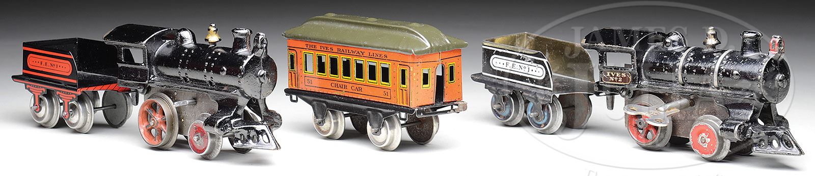 TWO IVES W/UP TRAINS & TWO CARS. Lot includes a cast iron No. 2 Ives locomotive, a second Ives locomotive not numbered but dated 1914, a No. 1 pullman car and a No. 51 Ives chair car. Also included is a newly manufactured Ives coal car. CONDITION: Second locomotive windup does not work; otherwise, lot averages good to very good. 1-12880 (300-400) Auction: Advertising, Toy & Doll - June 2013 Please Note: All prices include the hammer price plus the buyer’s premium, which is paid by the buyer as part of the purchase price. The prices noted here after the auction are considered unofficial and do not become official until after the 46th day. |