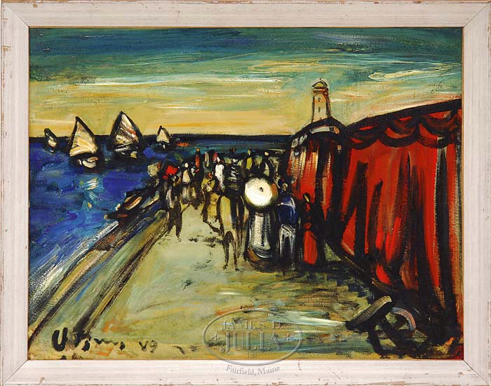 SYLVIAN VIGNY (French, 1903-1970) ALONG THE PIER. Oil on wood panel bright colored scene shows figures on a dock with building, lighthouse and four sailboats on blue ocean. Signed lower left and dated “49”. Housed in a gray painted wood frame. SIZE: 19-3/4″ x 25-1/2″. CONDITION: Very good. 9-95409 (1,500-3,000)