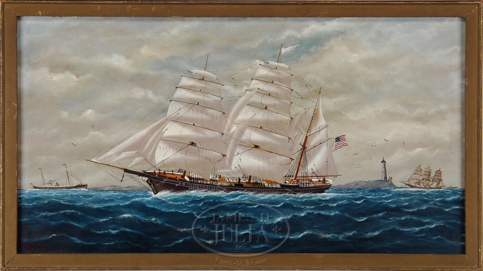 H R BUTMAN (American, First half of the 20th Century) PORTRAIT OF A THREE-MAST SHIP. Large oil on canvas nautical scene shows a black hulled three-mast ship flying American flag sailing right to left with lighthouse on point of land and other ships on a blue white capped ocean. White cloud sky with glimpses of blue. Signed lower left “H R Butman, 1932″. Housed in a gilt frame liner. SIZE: 25″ x 46-3/4”. CONDITION: Two patches to reverse with corresponding inpainting, very good. 9-97527 (4,750-5,250)