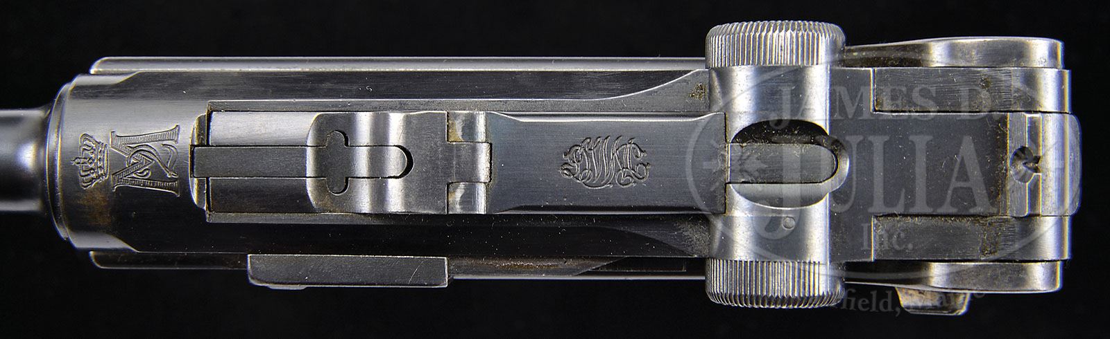 *◊ 1906 PORTUGUESE M2 LUGER. SN 3279. 4-3/4″ 30 Cal. bbl. “M2” crest above chamber. “DWM” scroll on center toggle link. Portuguese triangle in circle inspection/acceptance mark on receiver, bbl, and original wood bottom magazine. Grip safety. Checkered walnut grips. All numbered parts are matching. This gun is featured on pp. 570, 606 and 678 of Dr. Geoffrey Sturgess’ The Borchardt & Luger Automatic Pistols. PROVENANCE: Collection of Dr. Geoffrey Sturgess. CONDITION: Excellent retaining 97% original blue and 80% original straw. Bore is sharp with very light frosting. Grips are moderately worn with indentations. Magazine is excellent with some very minor corrosion to the body. Mechanics are sound. 4-52862 BWS63 (2,500-3,500)
